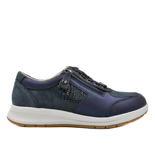 Leather upper for breathability, croc style pattern with navy patent for added design and style. Leather lining for an abrasion free environment and all day wear. Side zip and adjustable laces for a secure, personalised fit. Revere metal branding for luxe detail. Removable, padded insoles for superior comfort. Slip resistant sole for durability and traction on a variety of surfaces.