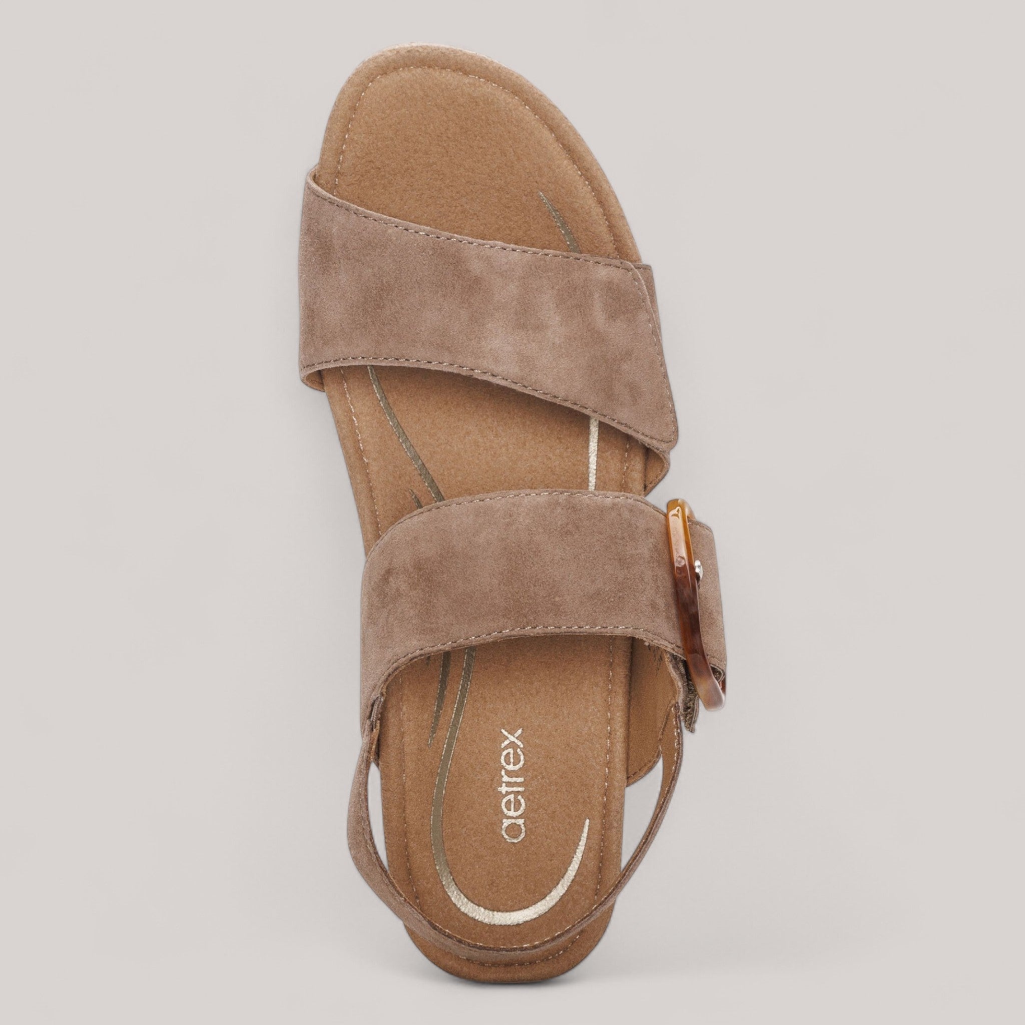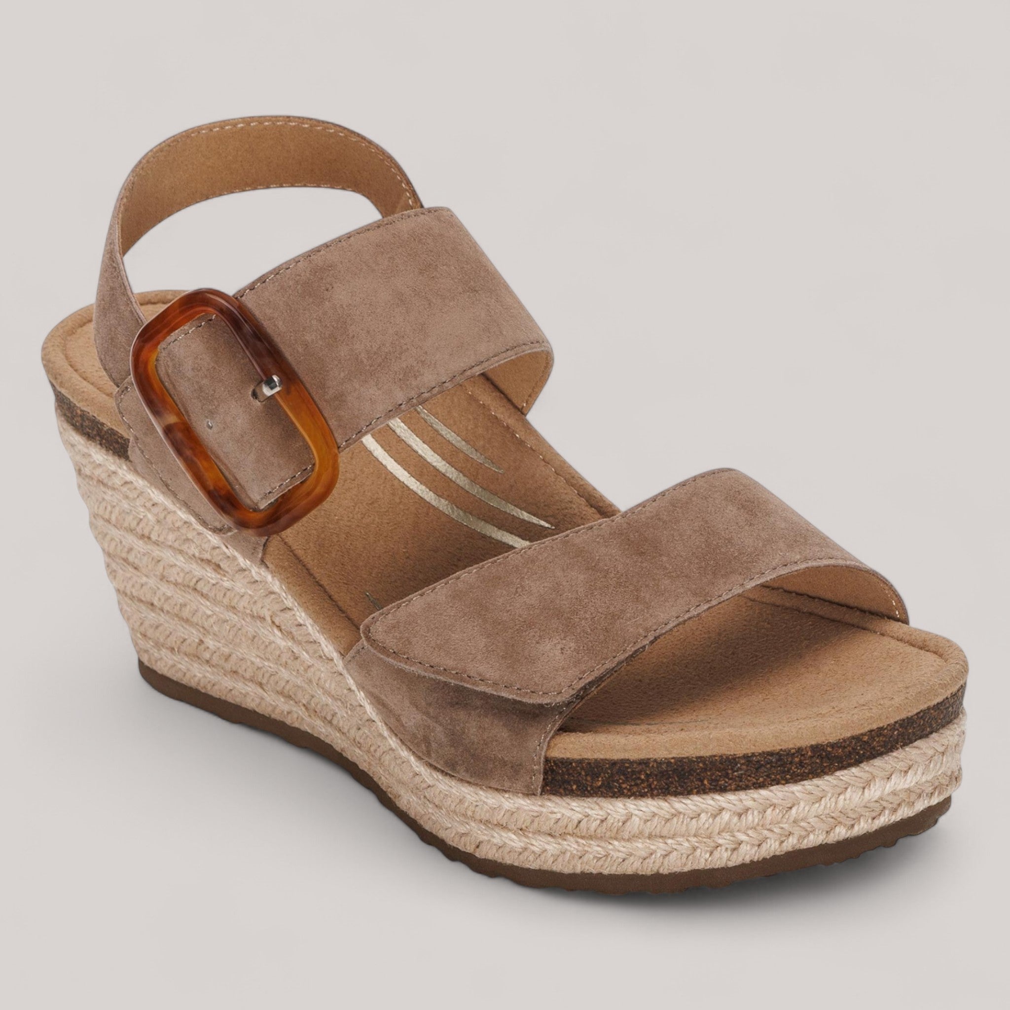 Step into summer with the Aetrex Ashley, an espadrille wedge that blends style, comfort, and stability. Featuring 8mm of memory foam cushioning and the Aetrex Cobra Orthotic System, Sydney provides targeted arch support to help relieve foot pain and plantar fasciitis. The genuine leather upper with hook & loop adjustability ensures a secure fit, while the jute-wrapped platform and lightweight cork midsole add natural texture and height. Finished with a microfiber footbed lining treated to resist odour and a blown rubber outsole for durable wear, this 3" wedge is your go-to for elevated summer comfort.