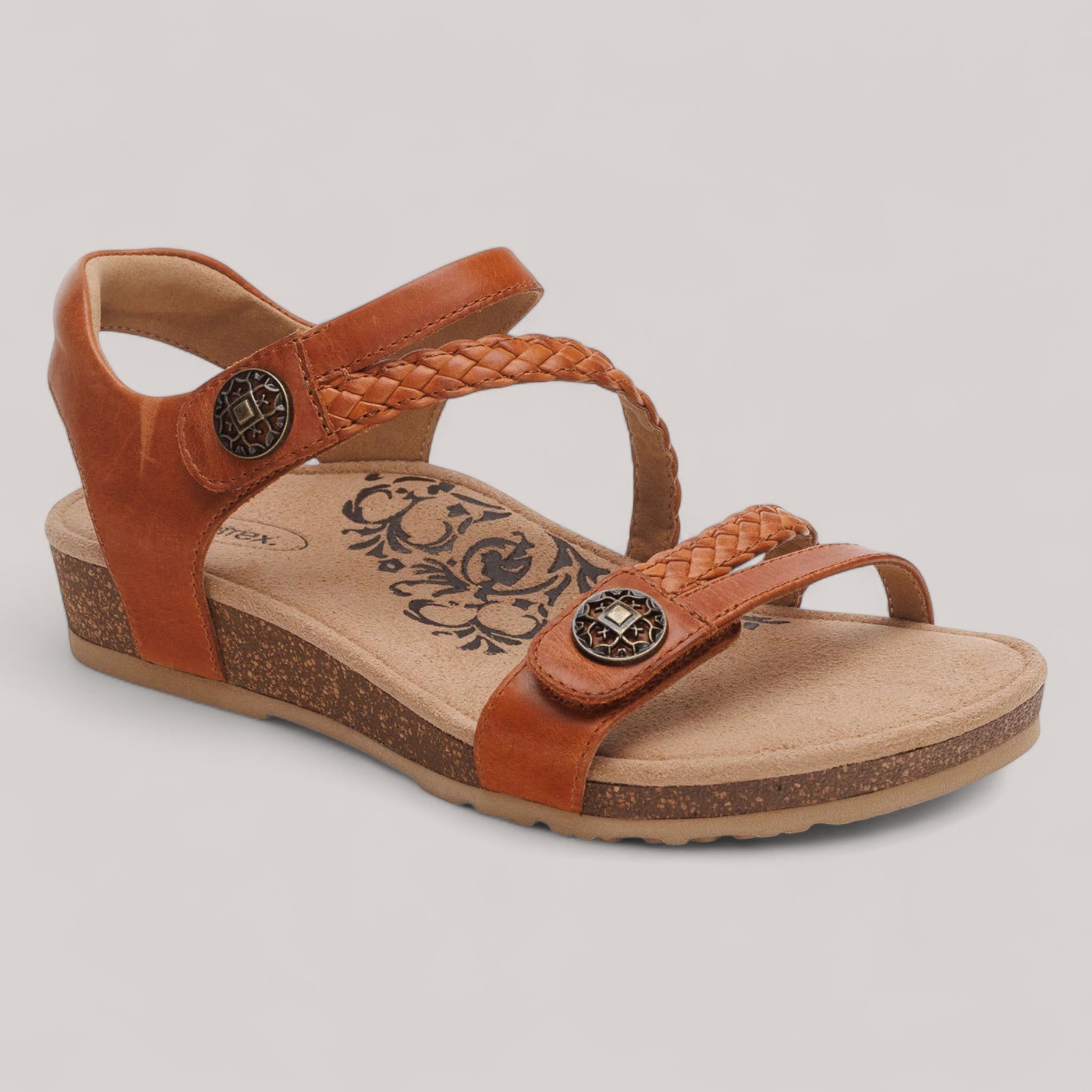 The Aetrex Jillian sandal is designed with Signature Arch Support to help align your body and reduce foot fatigue throughout the day. Fully adjustable for a personalised fit, it features memory foam cushioning, strategically placed straps to ease bunion discomfort, and a padded heel for added softness. The ultra-light cork midsole provides cushioned support without the weight, while the signature braided detailing adds a stylish finish—perfect for all your warm-weather adventures.