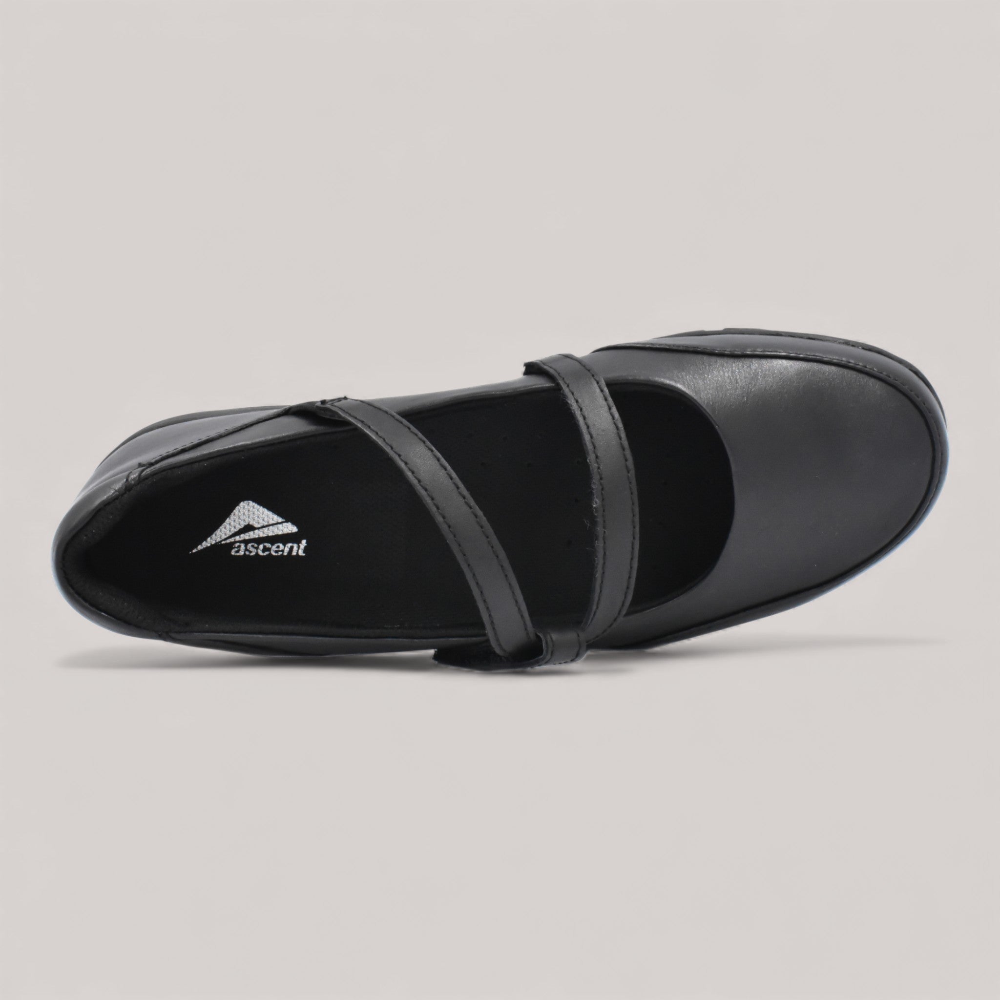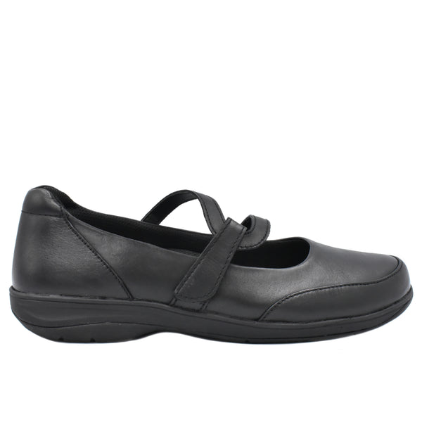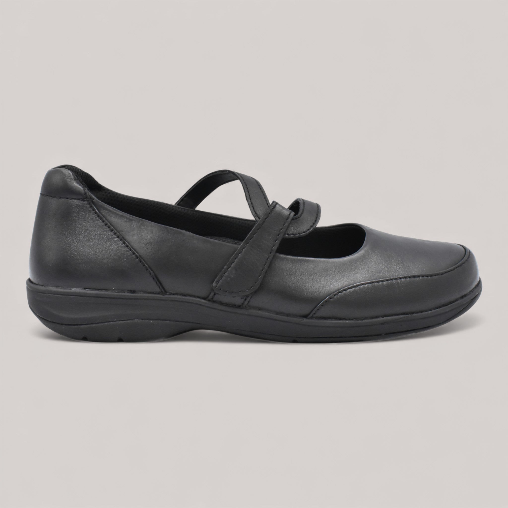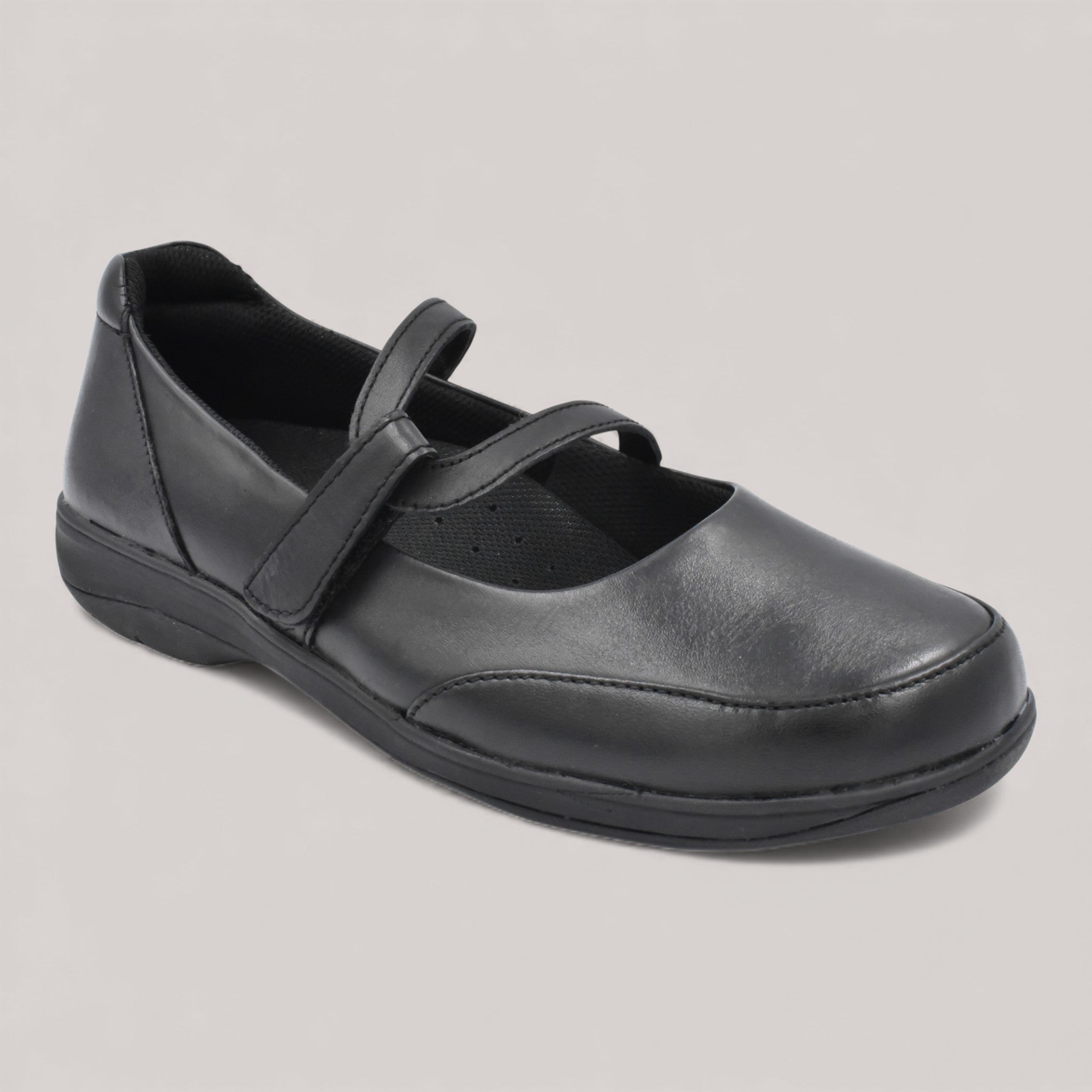 Leather upper Mary-jane that features hidden arch support. Slip on closure with elasticised inner pieces and easy to adjust Velcro strap. Mesh lining for an abrasion-free environment for all day wear. Bungee midsole with a soft feel underfoot and a removable EVA Ortholite insole. SRA slip resistant rubber outsole for flexibility, durability and traction on a variety of surfaces.