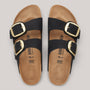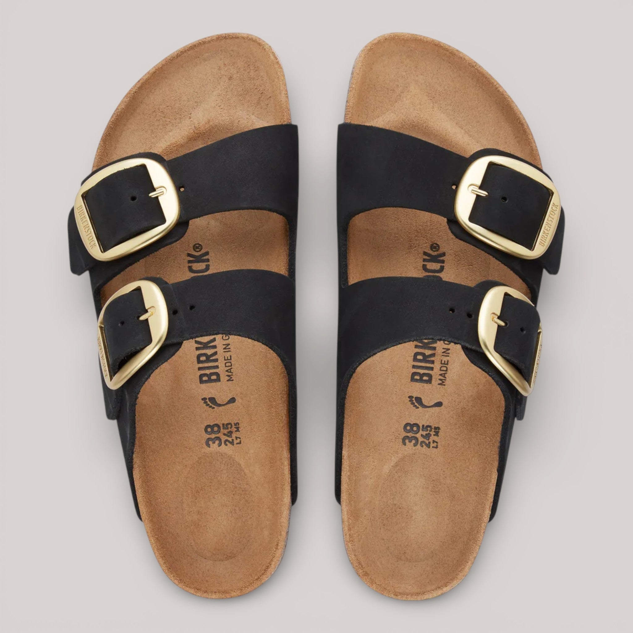 The iconic Birkenstock Arizona gets a bold update with the Big Buckle edition, featuring oversized pin buckles for a refined yet minimalist look. Crafted from thick nubuck leather with an open-selvage finish, it combines premium materials with timeless style. The anatomically shaped cork-latex footbed, lined in soft suede, offers personalised comfort and support, while the lightweight EVA sole ensures flexibility and durability. Made in Germany.