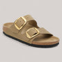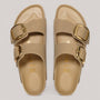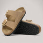 The iconic Birkenstock Arizona gets a bold update with the Big Buckle edition, featuring oversized pin buckles for a refined yet minimalist look. Crafted from thick nubuck leather with an open-selvage finish, it combines premium materials with timeless style. The anatomically shaped cork-latex footbed, lined in soft suede, offers personalised comfort and support, while the lightweight EVA sole ensures flexibility and durability. Made in Germany.