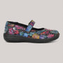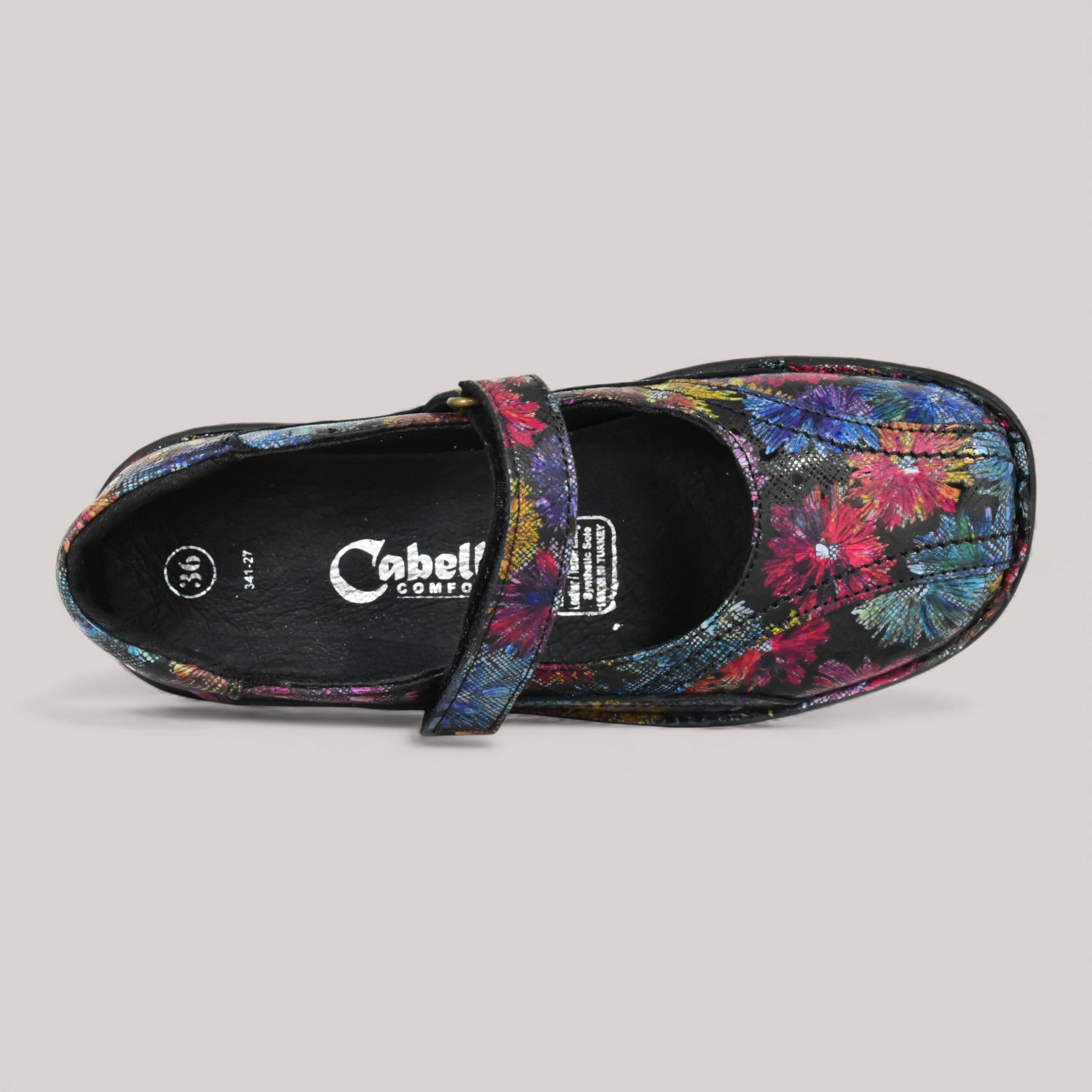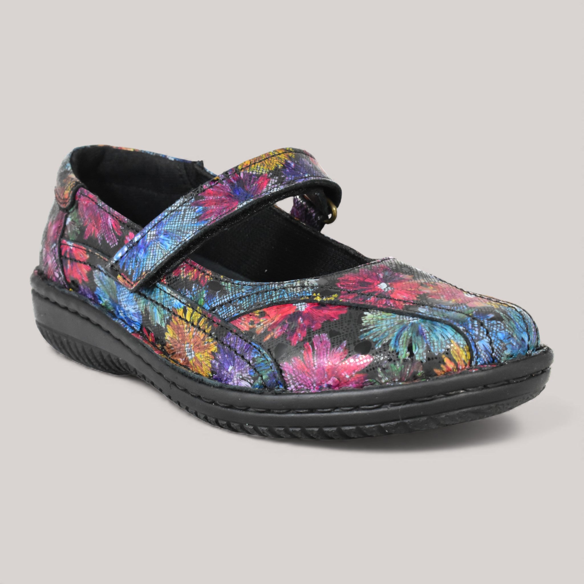 Leather upper for breathability with stitching detail for added interest. Slip on closure with adjustable Mary-Jane velcro strap for easy on-off wear. Leather and textile lining for an abrasion-free environment for all-day wear and a perfect inner climate. Removable leather covered, highly padded insole for superior comfort. Synthetic sole for flexibility and traction on a variety of surfaces.