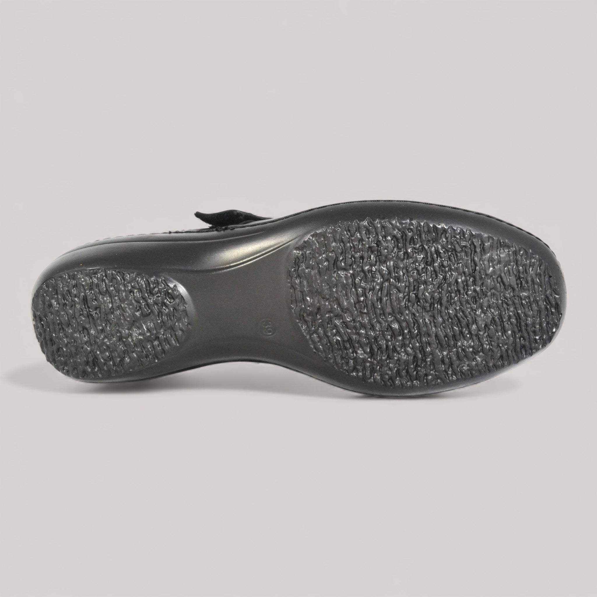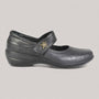 Leather upper for breathability with button accent for added interest. Slip on closure with adjustable Mary-Jane velcro strap for easy on-off wear. Leather and textile lining for an abrasion-free environment for all-day wear and a perfect inner climate. Removable leather covered, highly padded insole for superior comfort. Synthetic sole for flexibility and traction on a variety of surfaces.