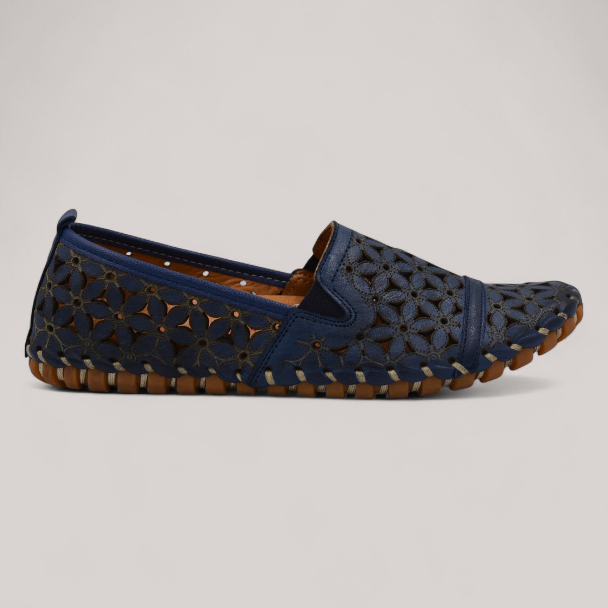 Enjoy everyday comfort with this stylish and supportive slip-on shoe, crafted in Turkey for quality and durability. Featuring a breathable leather lining and a removable leather insole, it’s designed to accommodate custom orthotics while maintaining a sleek look. The intricate cut-out floral design adds a touch of elegance, while elastic gussets allow for easy on-and-off wear. A flexible rubber sole provides excellent grip and cushioning, making it ideal for all-day use. Perfect for casual outings, warm-weather wear, or relaxed social gatherings, this orthotic-friendly shoe blends fashion with function for effortless comfort.