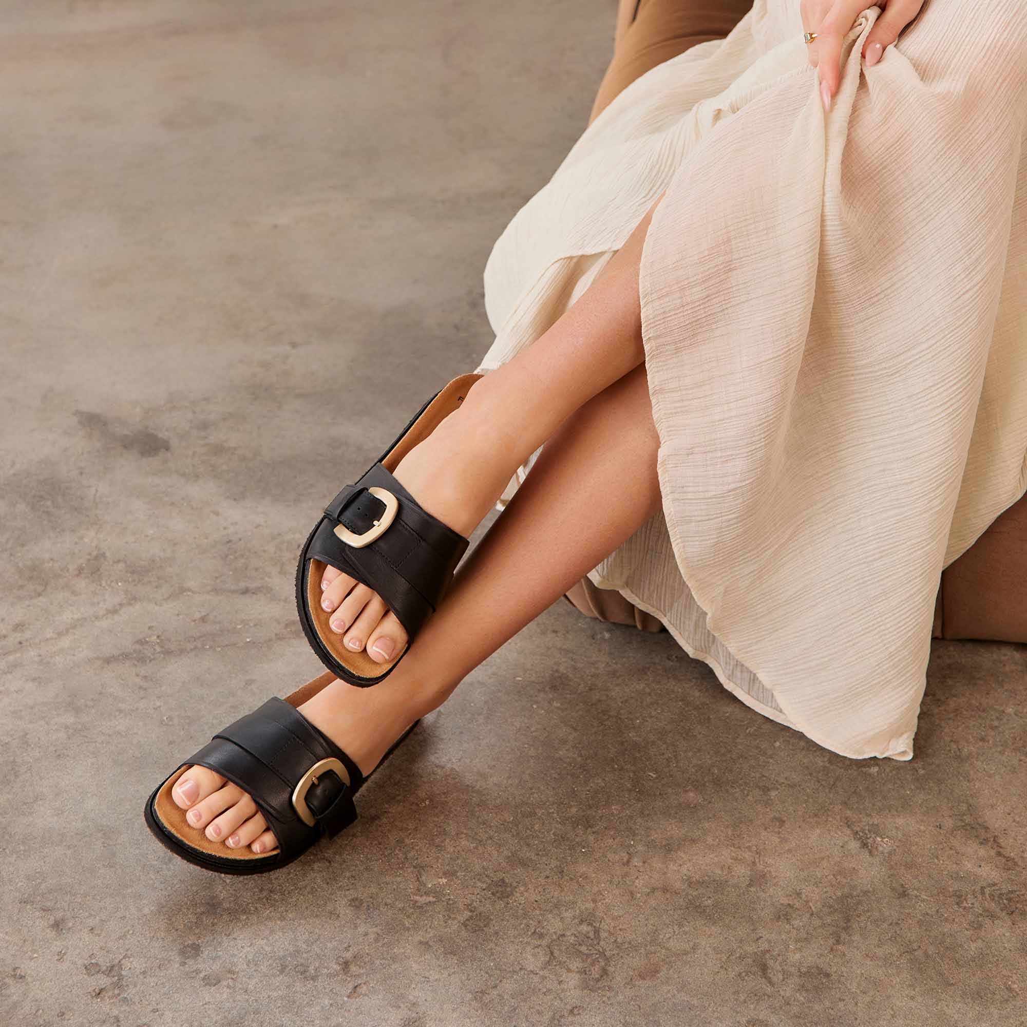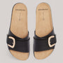 Effortless sophistication meets thoughtful support. Monterey in Black is an elevated slide that blends everyday ease with refined details — smooth leather, a statement buckle, and an adjustable upper strap that fits wide and narrow soles with ease for a perfectly tailored feel. Set on our podiatrist-designed Sole Hero® Footbed, moulded with lightweight, flexible rice husk (an upcycled agricultural byproduct), it delivers built-in heel, arch, and forefoot support for all-day comfort. It’s luxury you can slide into, every day.
