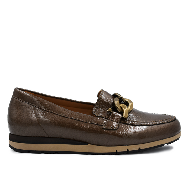 Crafted from a stylish mix of glossy patent leather and soft suede, Gabor’s loafer is a refined staple for any wardrobe. A sleek chain detail adds a touch of sophistication, while the leather lining ensures a luxurious feel. Designed for all-day comfort, this loafer features a removable insole for a customised fit. Perfect for both casual and dressy occasions, it’s the ideal blend of classic style and modern practicality.
