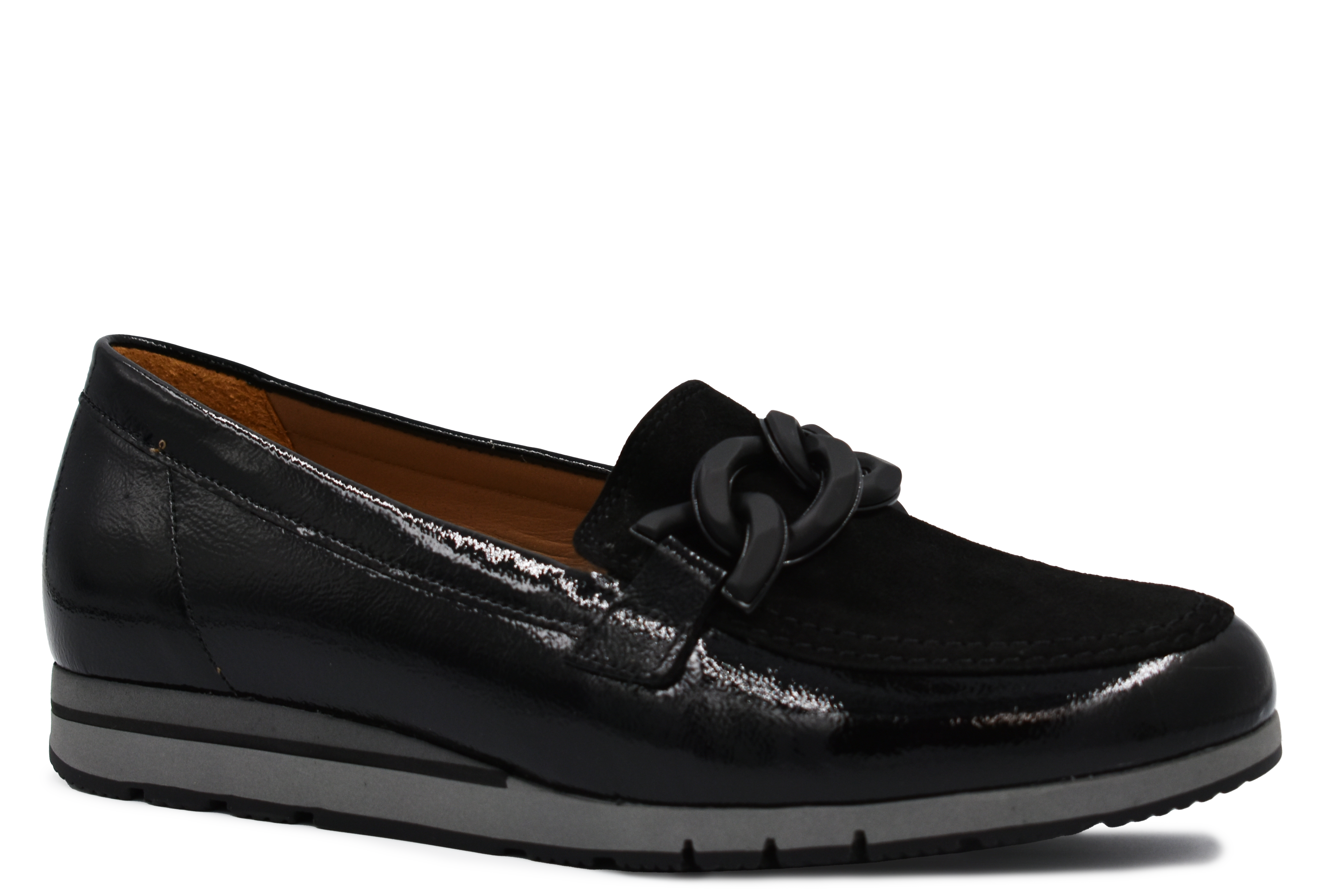 Crafted from a stylish mix of glossy patent leather and soft suede, Gabor’s loafer is a refined staple for any wardrobe. A sleek chain detail adds a touch of sophistication, while the leather lining ensures a luxurious feel. Designed for all-day comfort, this loafer features a removable insole for a customised fit. Perfect for both casual and dressy occasions, it’s the ideal blend of classic style and modern practicality.