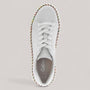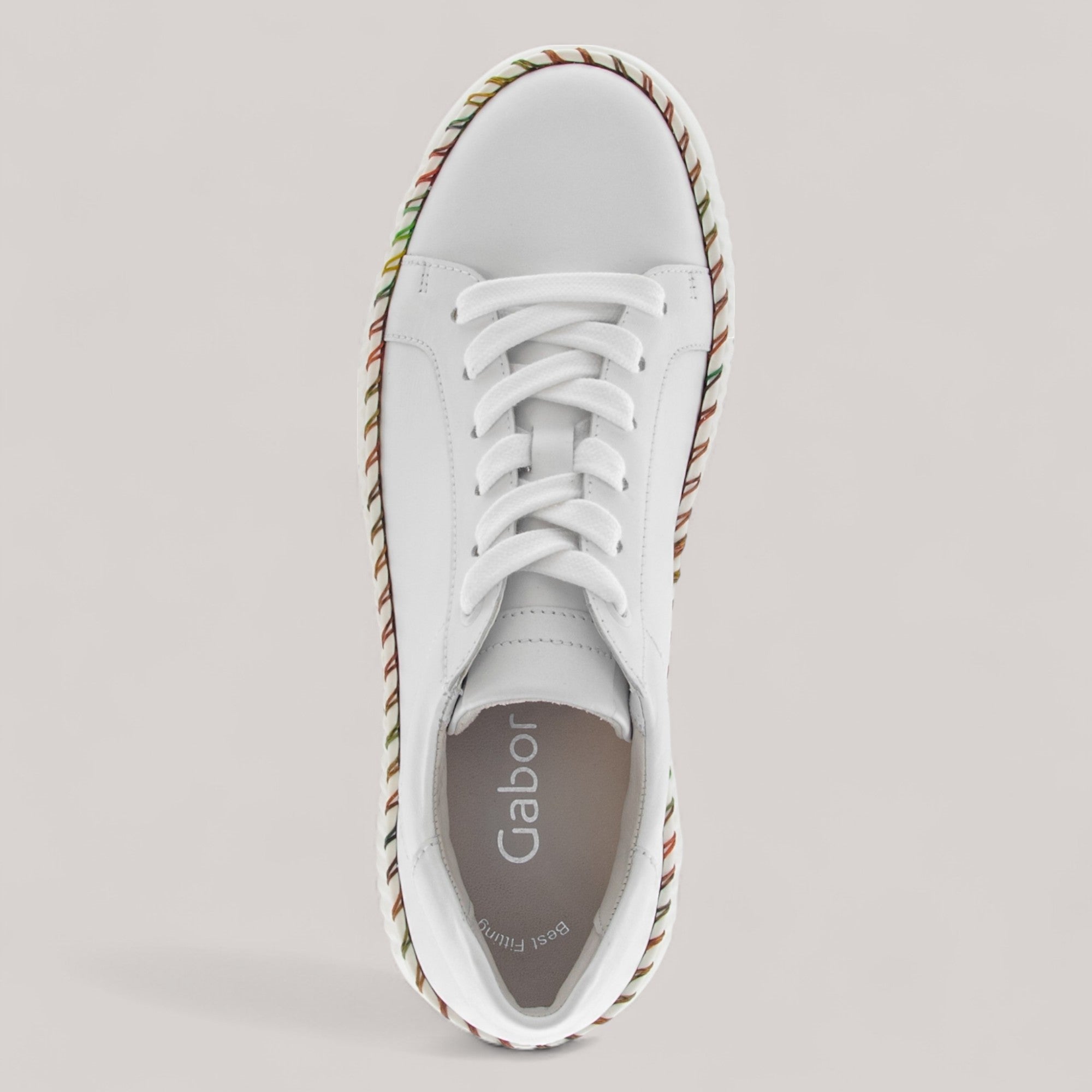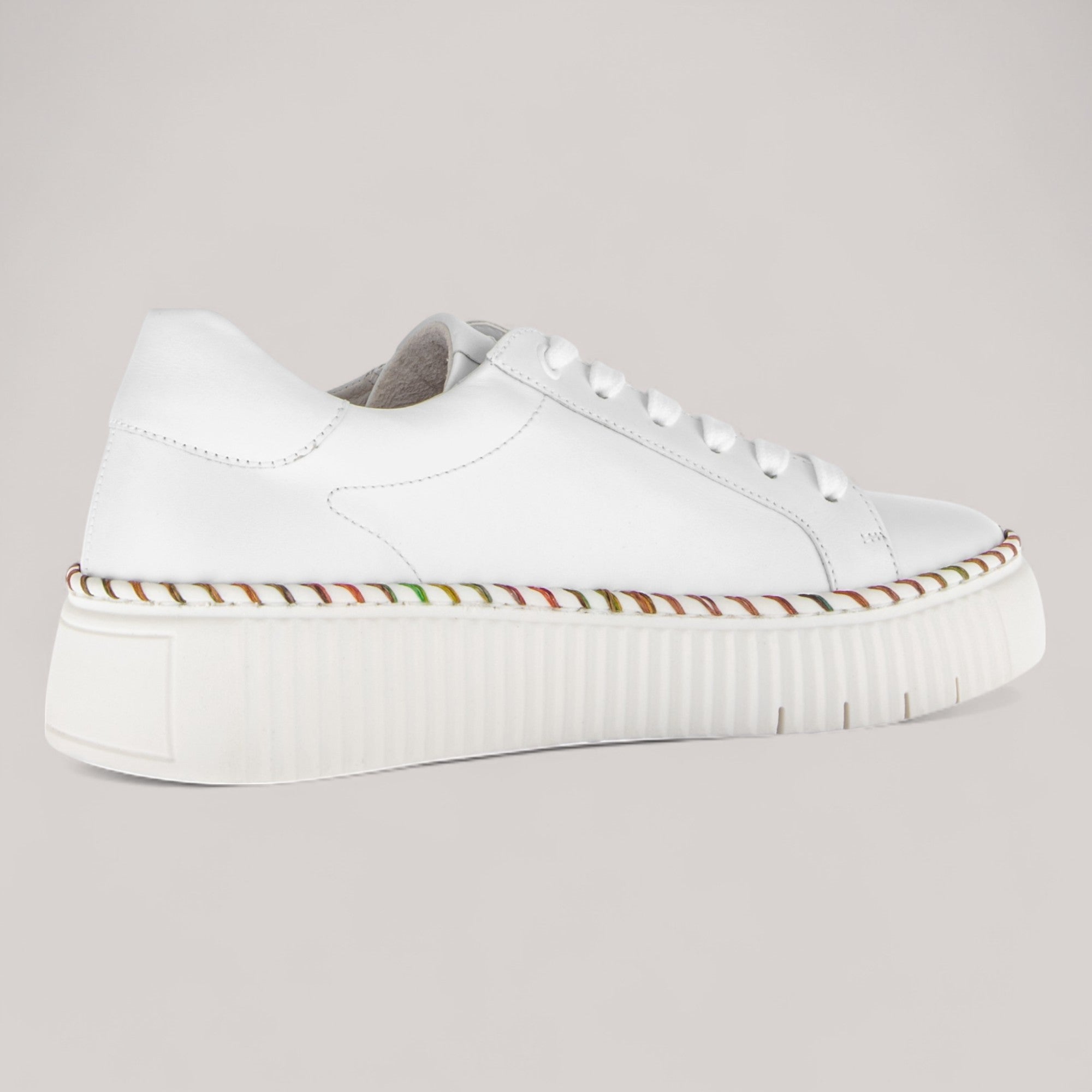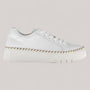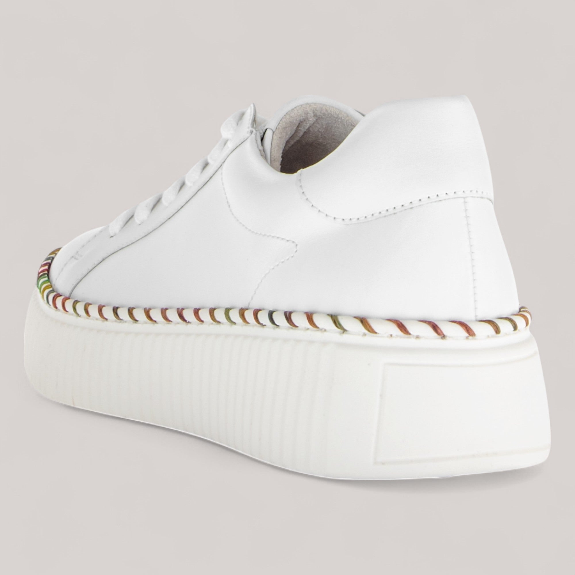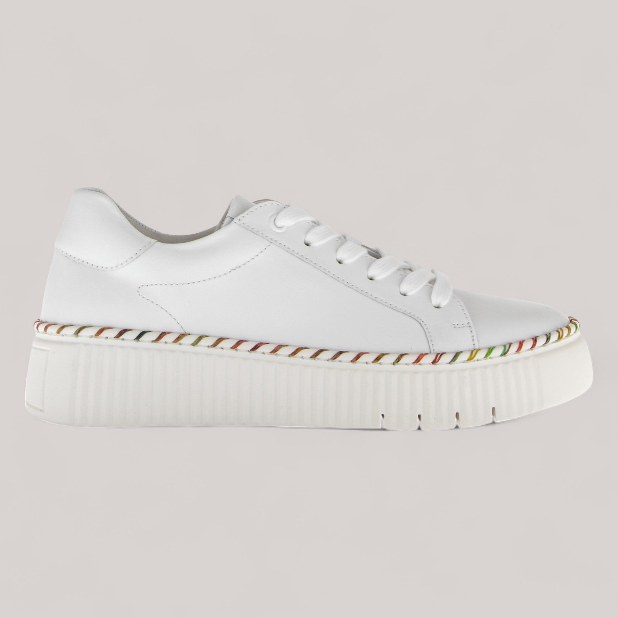 This white leather sneaker blends timeless style with playful detail. Featuring a thick, ribbed sole for added comfort and durability, it’s accented with a vibrant braided trim that adds a unique pop of personality. Finished with crisp white laces and a smooth upper, this sneaker is perfect for everyday wear—bringing a fresh, fun edge to any outfit.