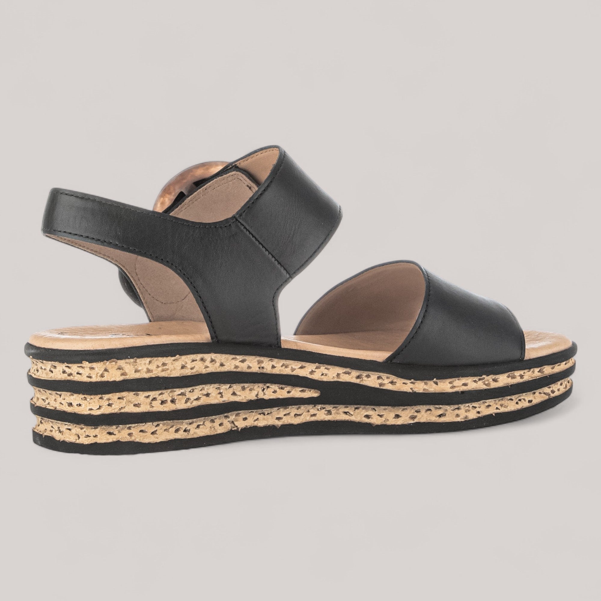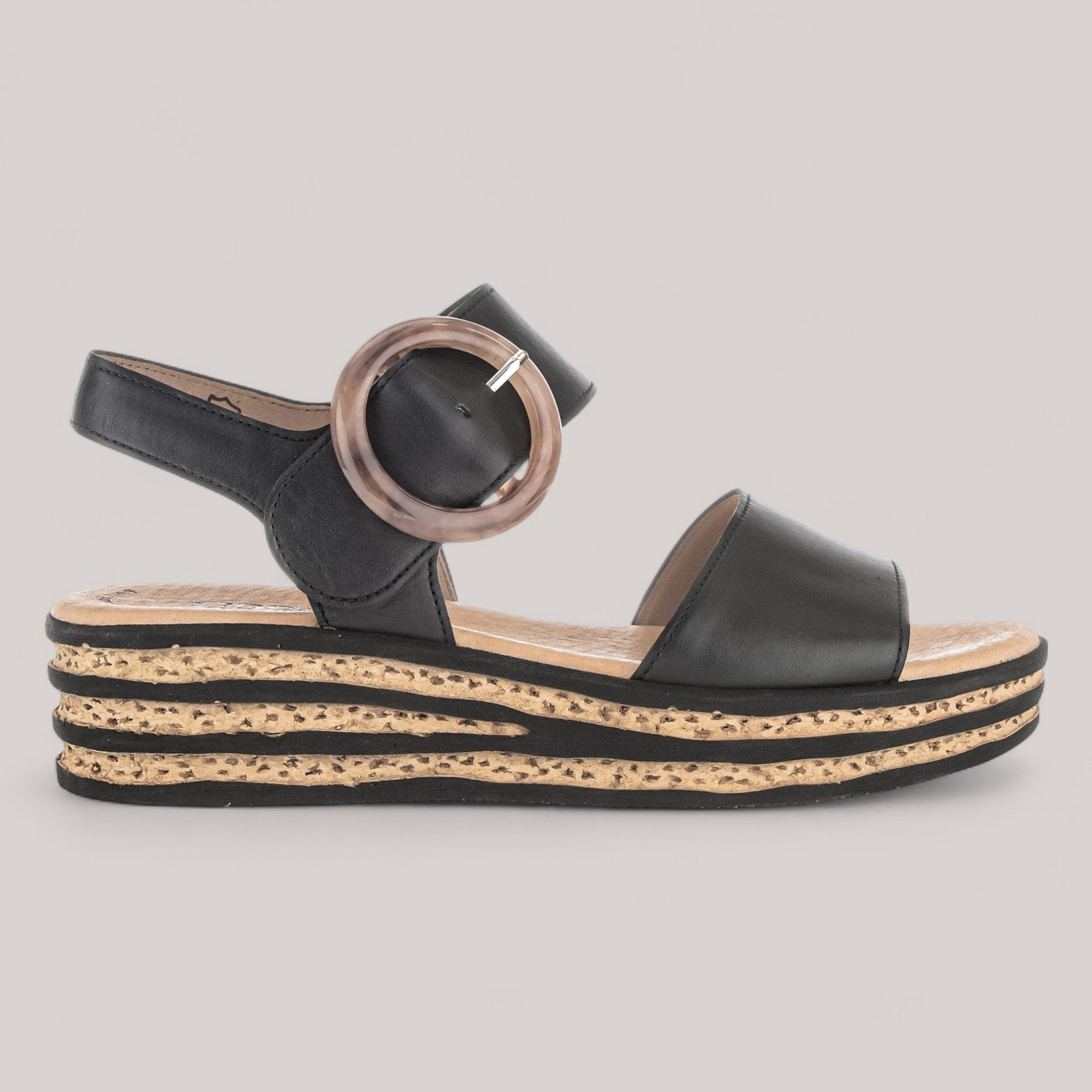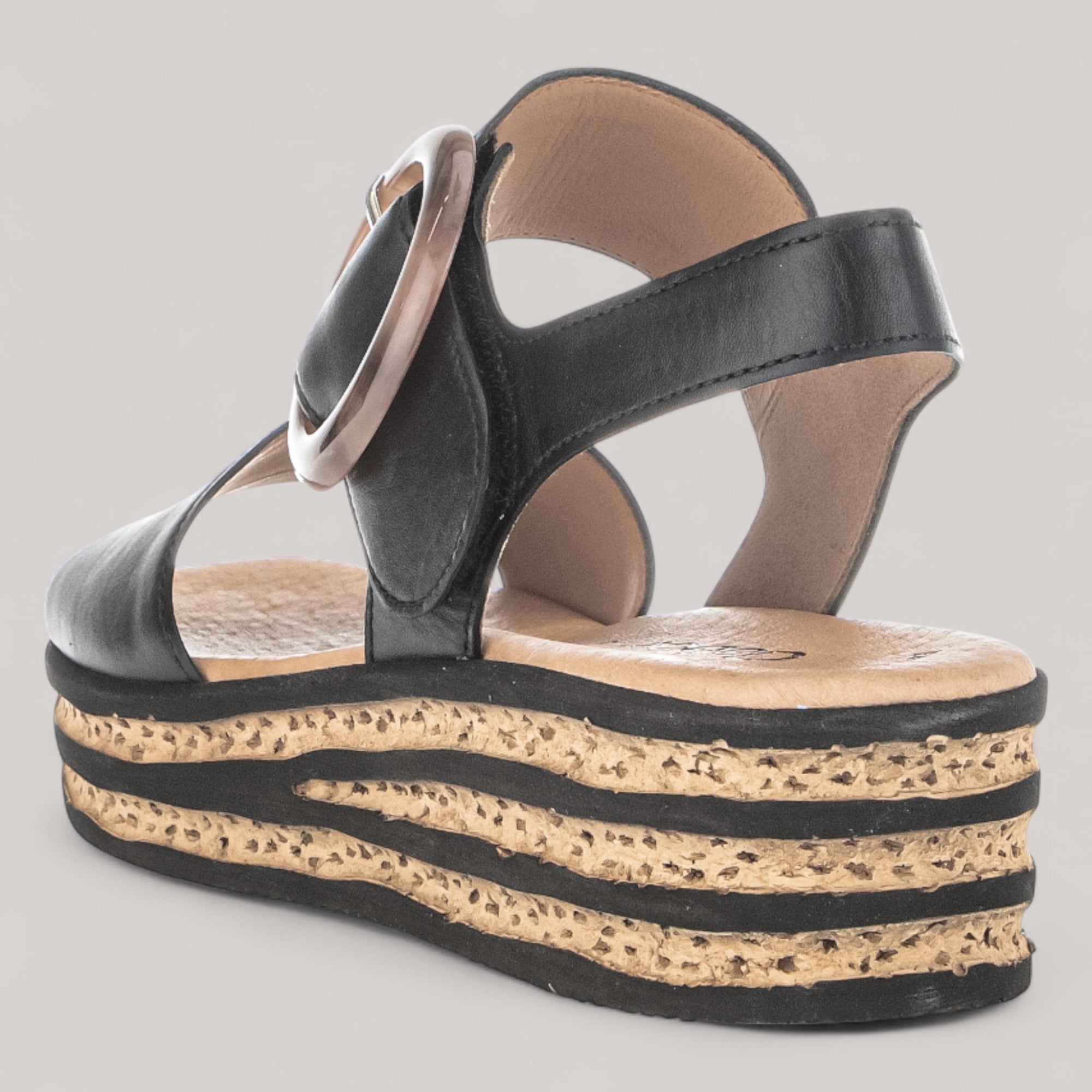 This platform sandal combines bold design with premium materials for a standout look. Featuring a sleek black leather straps and statement circular buckle, it offers both style and support. The layered sole adds texture and lift, making it perfect for elevating everyday outfits. Crafted for comfort and designed to turn heads, this sandal is your go-to for effortless chic.