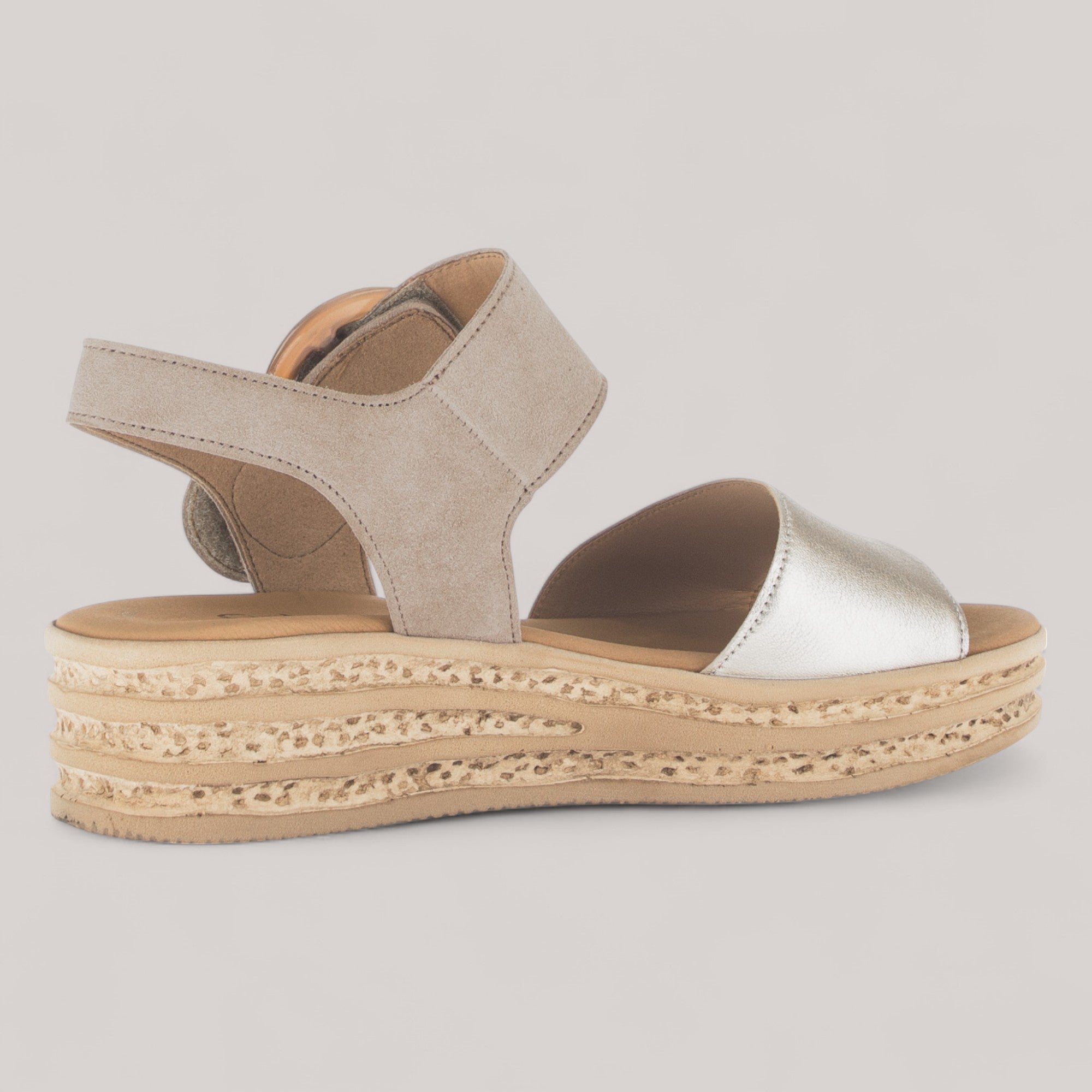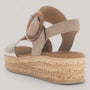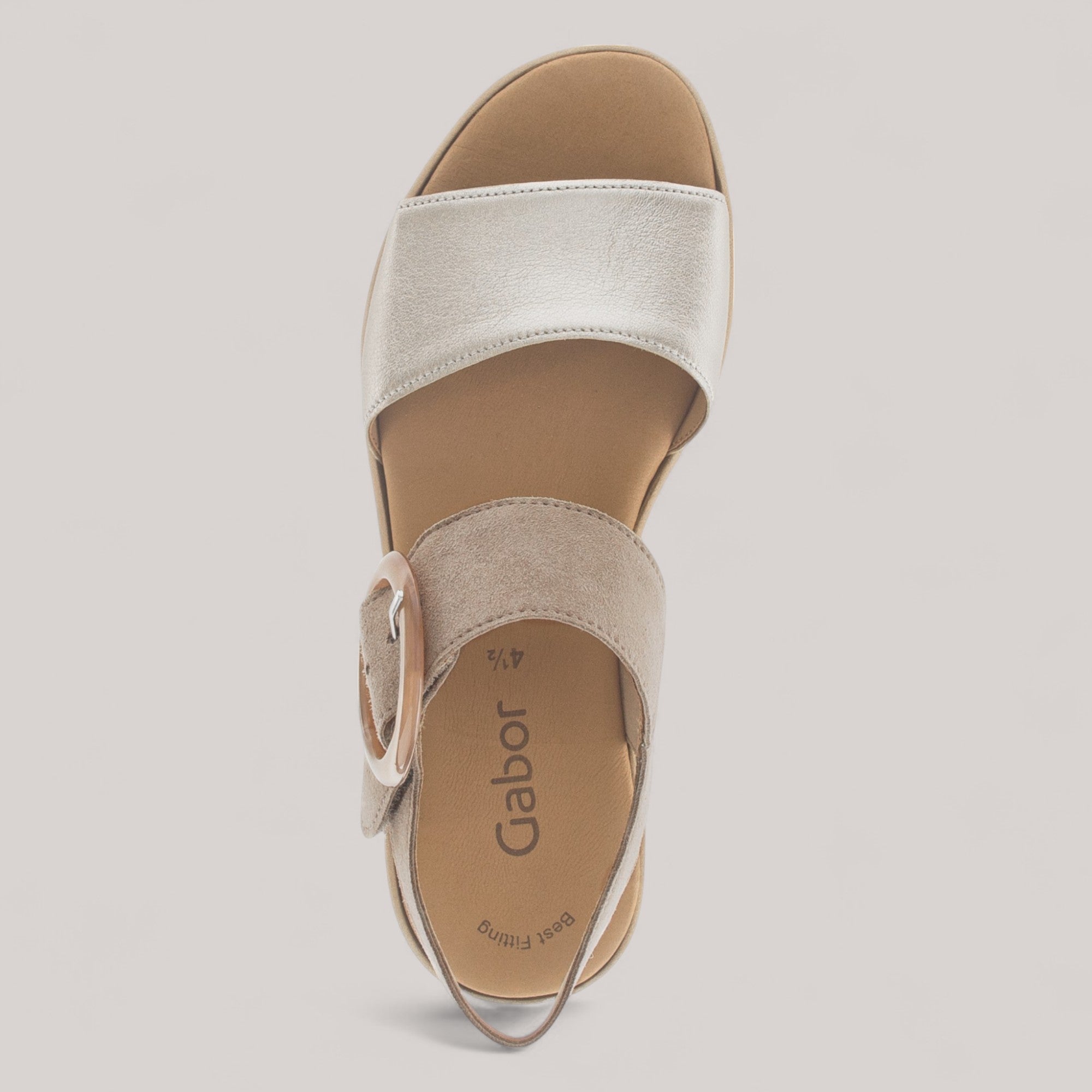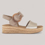 This platform sandal combines bold design with premium materials for a standout look. Featuring a sleek metallic front strap and a soft leather ankle strap with a statement circular buckle, it offers both style and support. The layered sole adds texture and lift, making it perfect for elevating everyday outfits. Crafted for comfort and designed to turn heads, this sandal is your go-to for effortless chic.