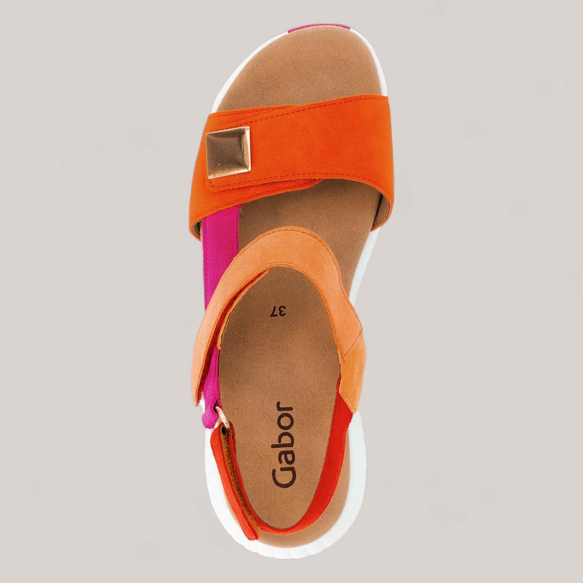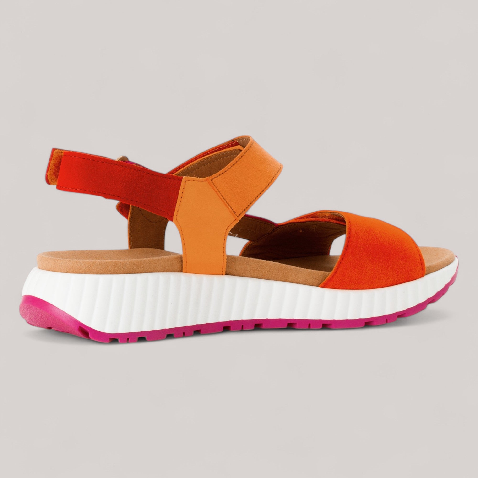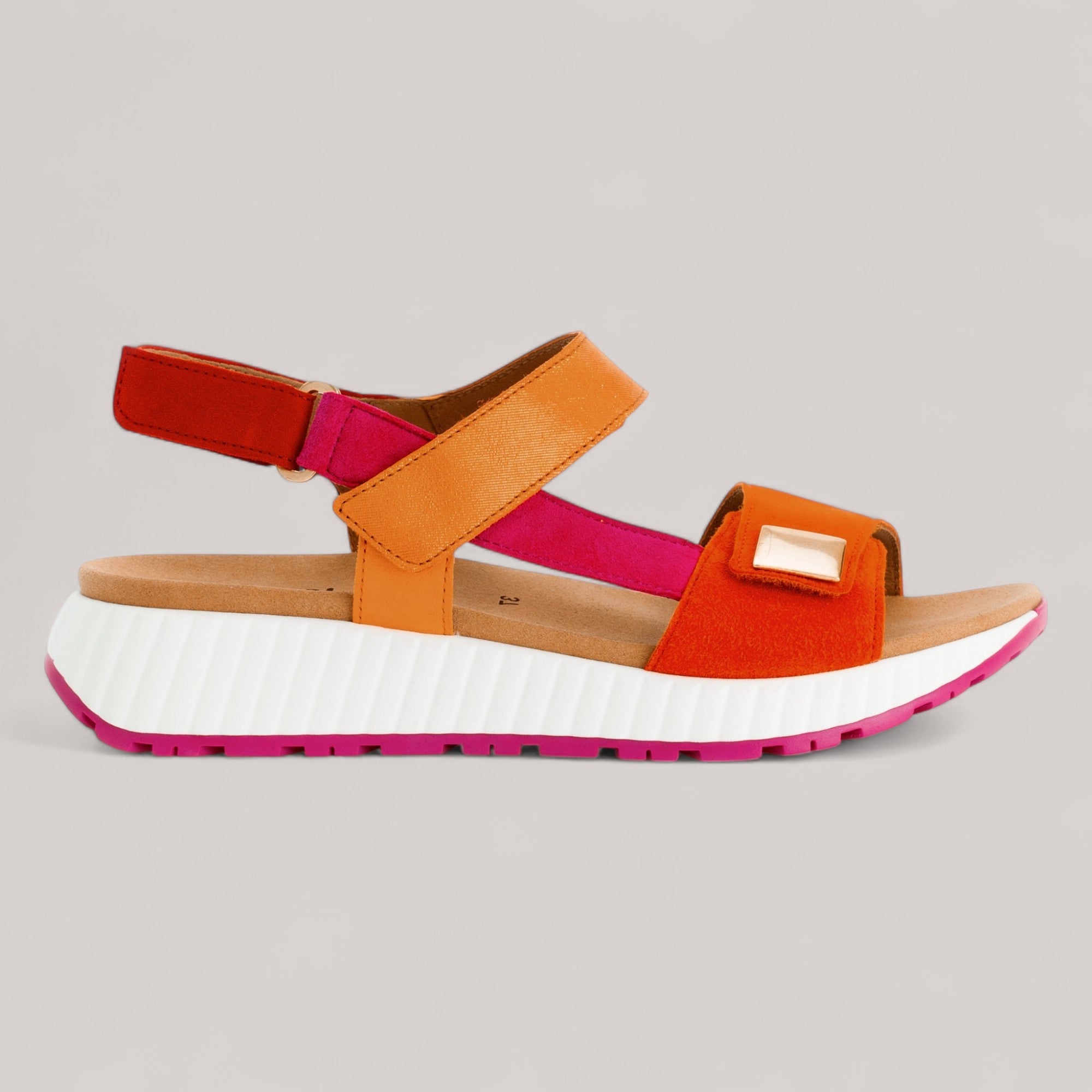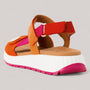 Make a statement with this eye-catching sandal, designed for those who love to stand out. Featuring a chunky white sole with a fun pink tread, it combines bold color-blocked straps in orange, tan, and red for a fresh, modern look. The soft pink lining adds a touch of comfort and charm, while the secure fit ensures all-day wearability. Whether you're strolling the city or heading out on holiday, this sandal brings personality and comfort to every step.