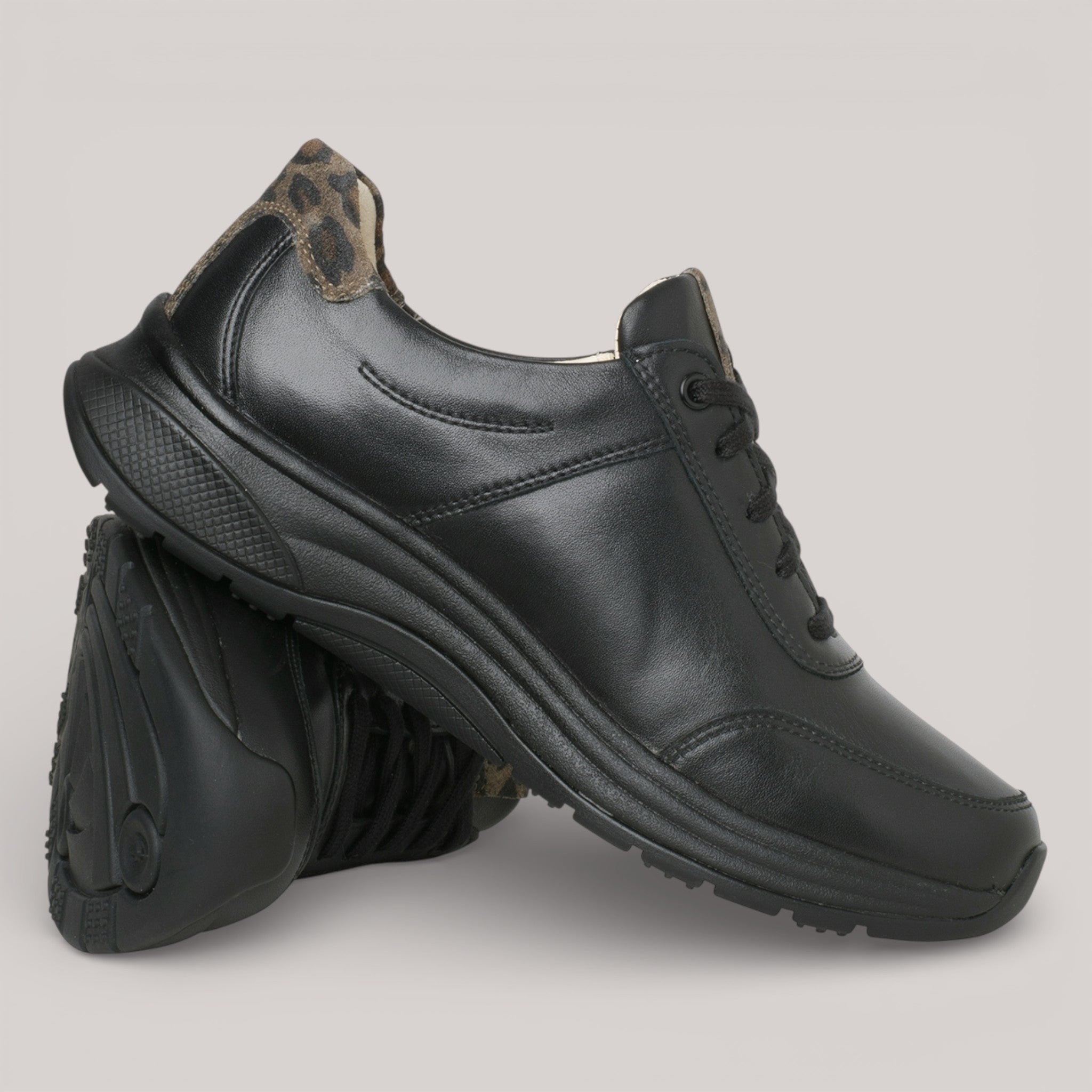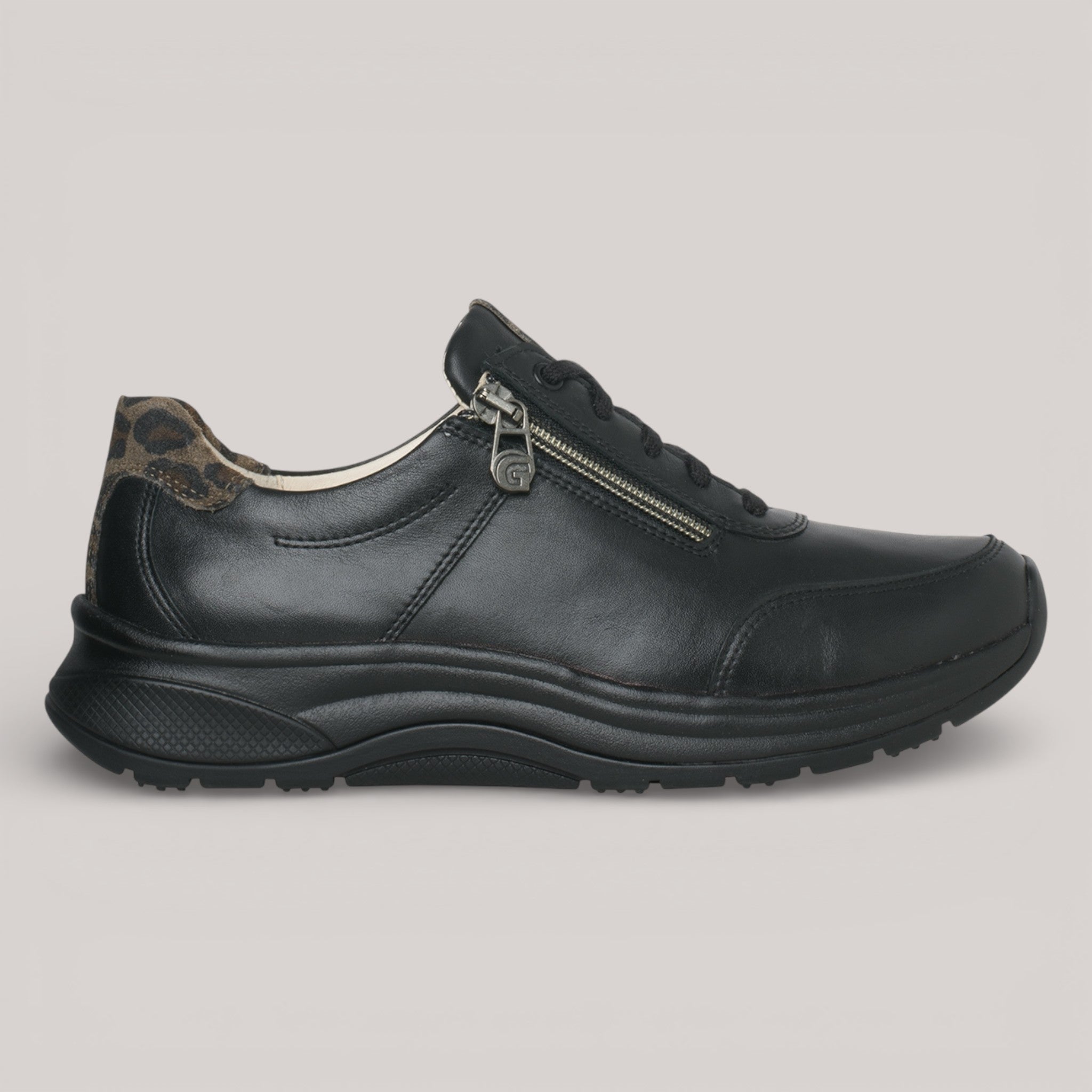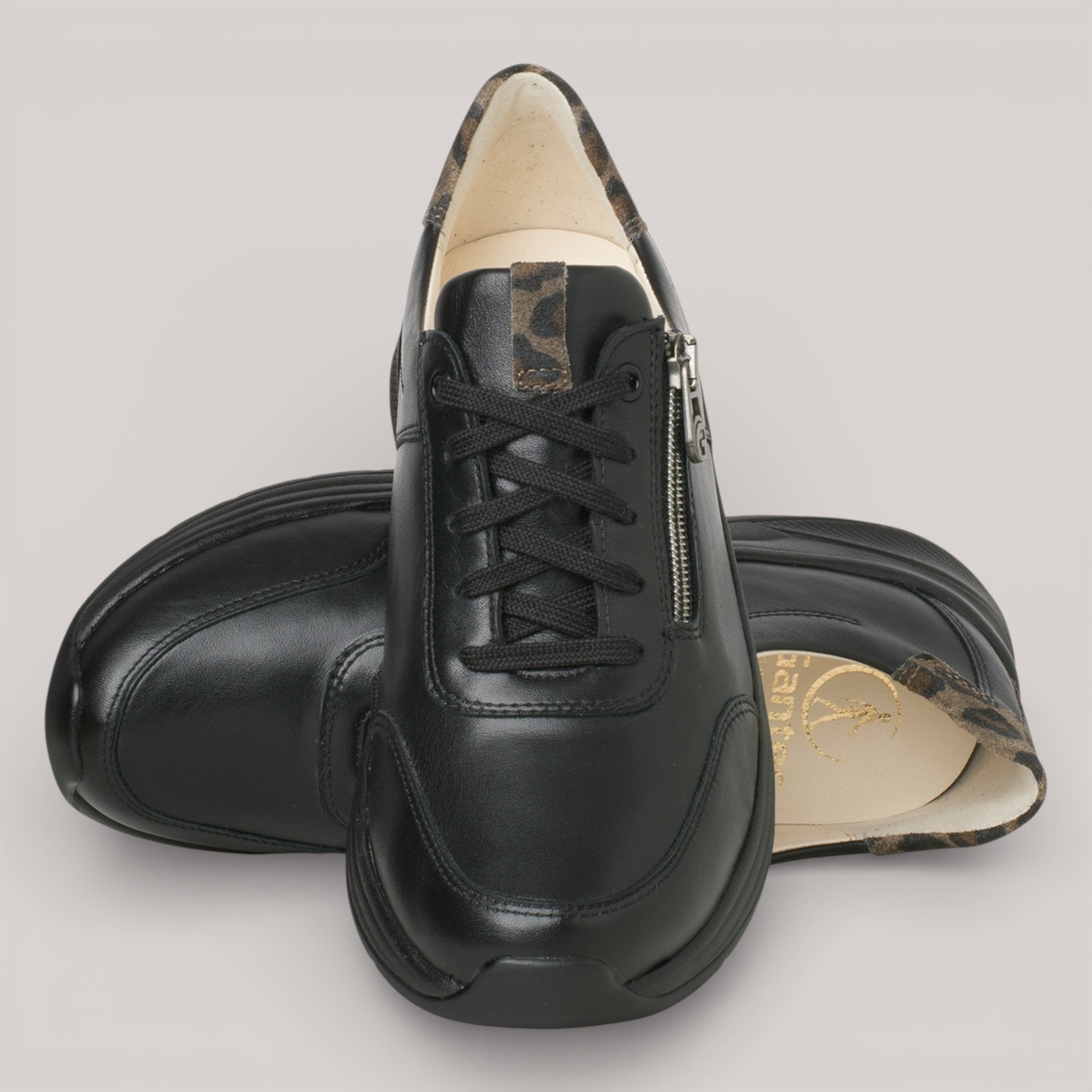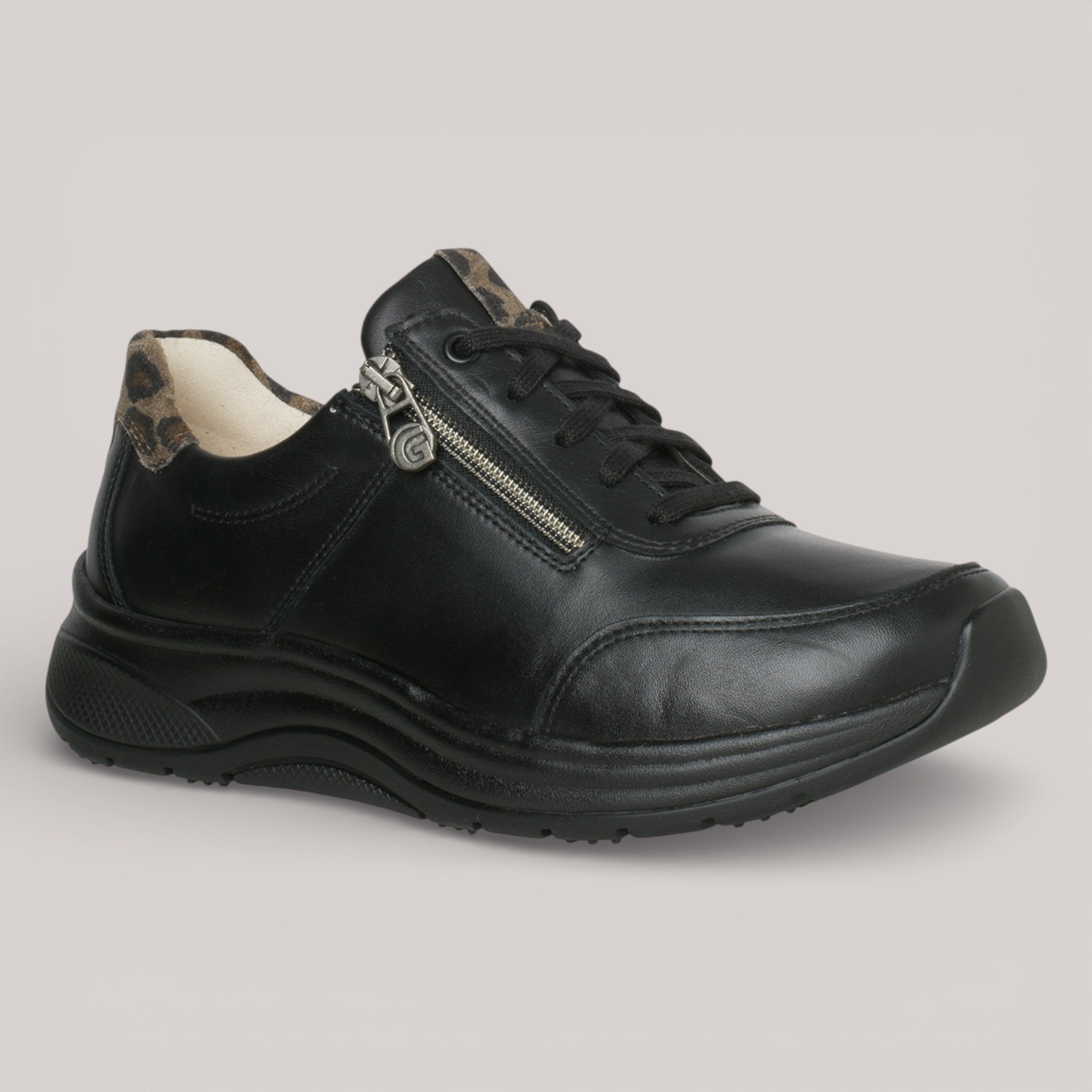Black leather sneaker elevated by GANTER AKTIV technology—a patented 4-point rolling sole that massages with each step, promoting upright posture and joint relief. Soft smooth leather with luxurious lining pairs with a functional side zipper for effortless slip-on comfort. Subtle leopard print heel detail adds understated sophistication. Engineered for extended wear without fatigue.