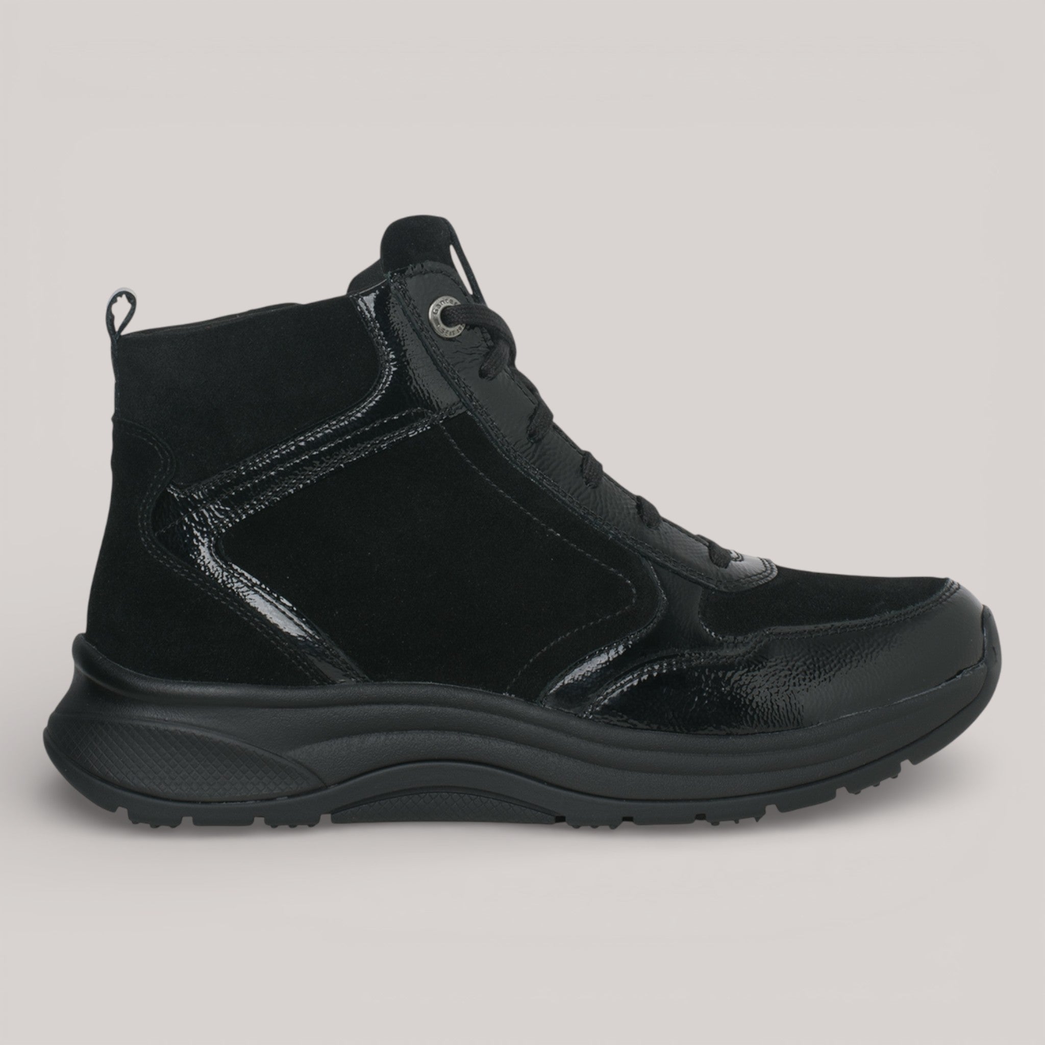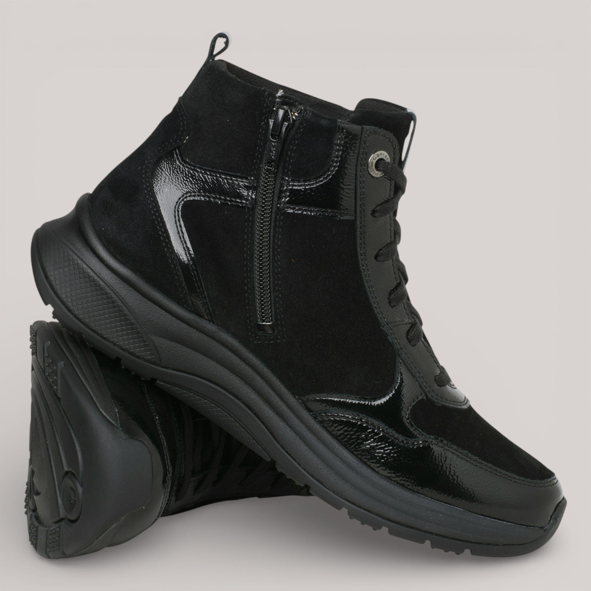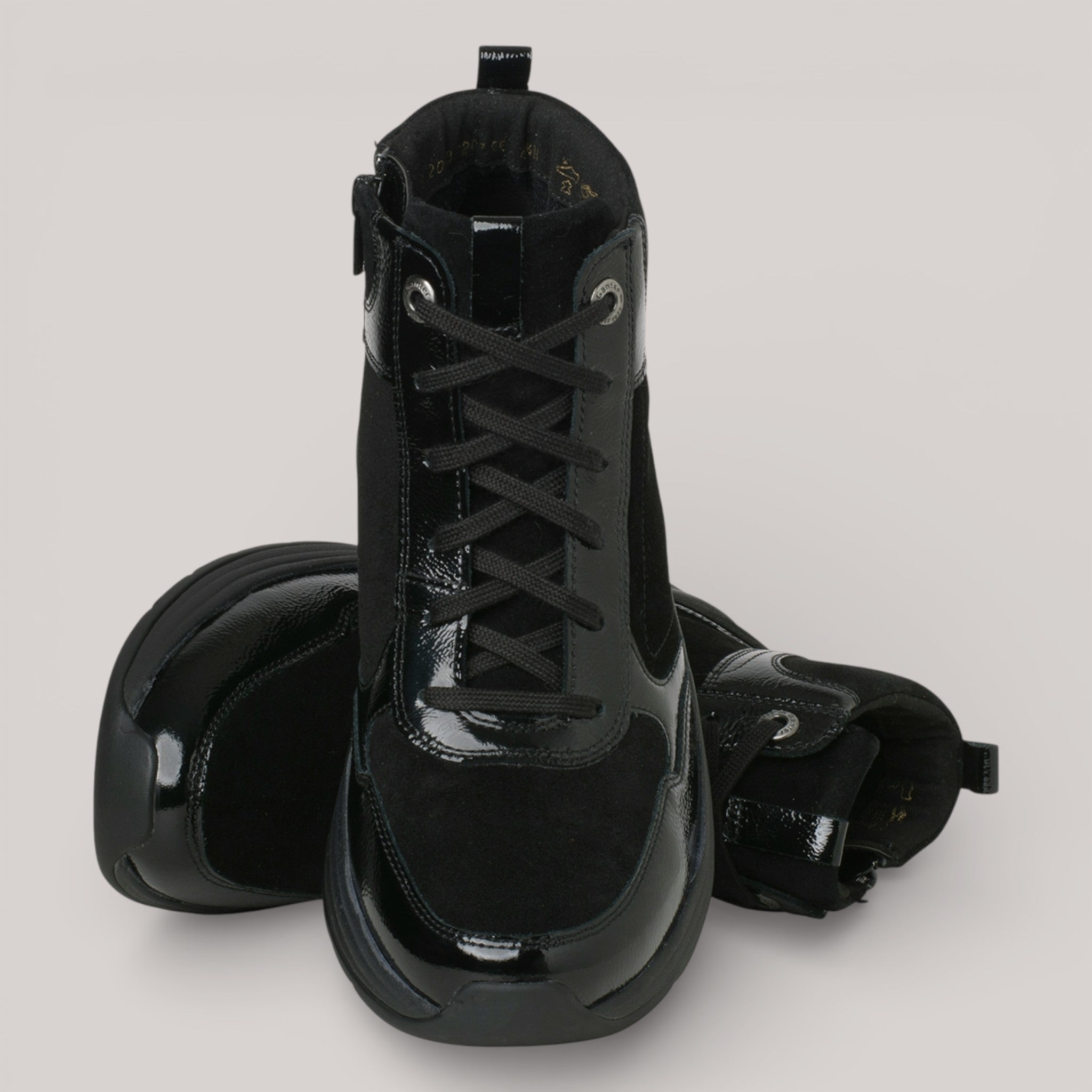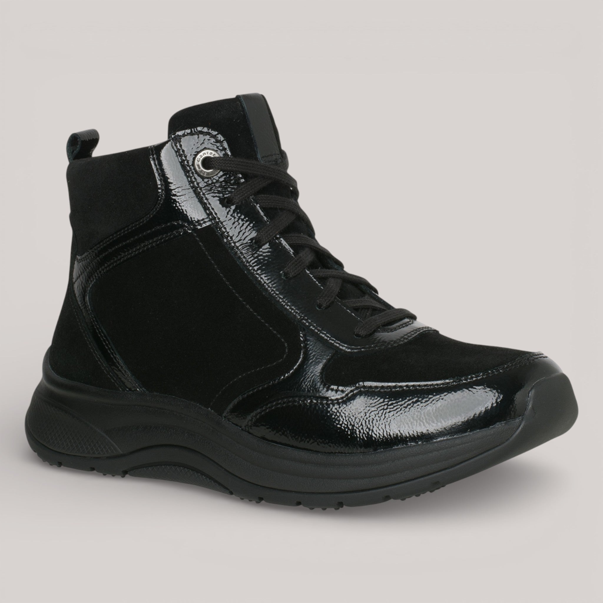 The HIGH FLYER pairs elegant design with engineered comfort. Glossy patent leather and suede construction, lined in natural wool, deliver seasonal warmth and visual refinement. An inner zipper ensures quick entry. GANTER AKTIV technology sets this bootie apart—its patented 4-point rolling sole promotes upright posture, spinal support, and joint relief with every step.