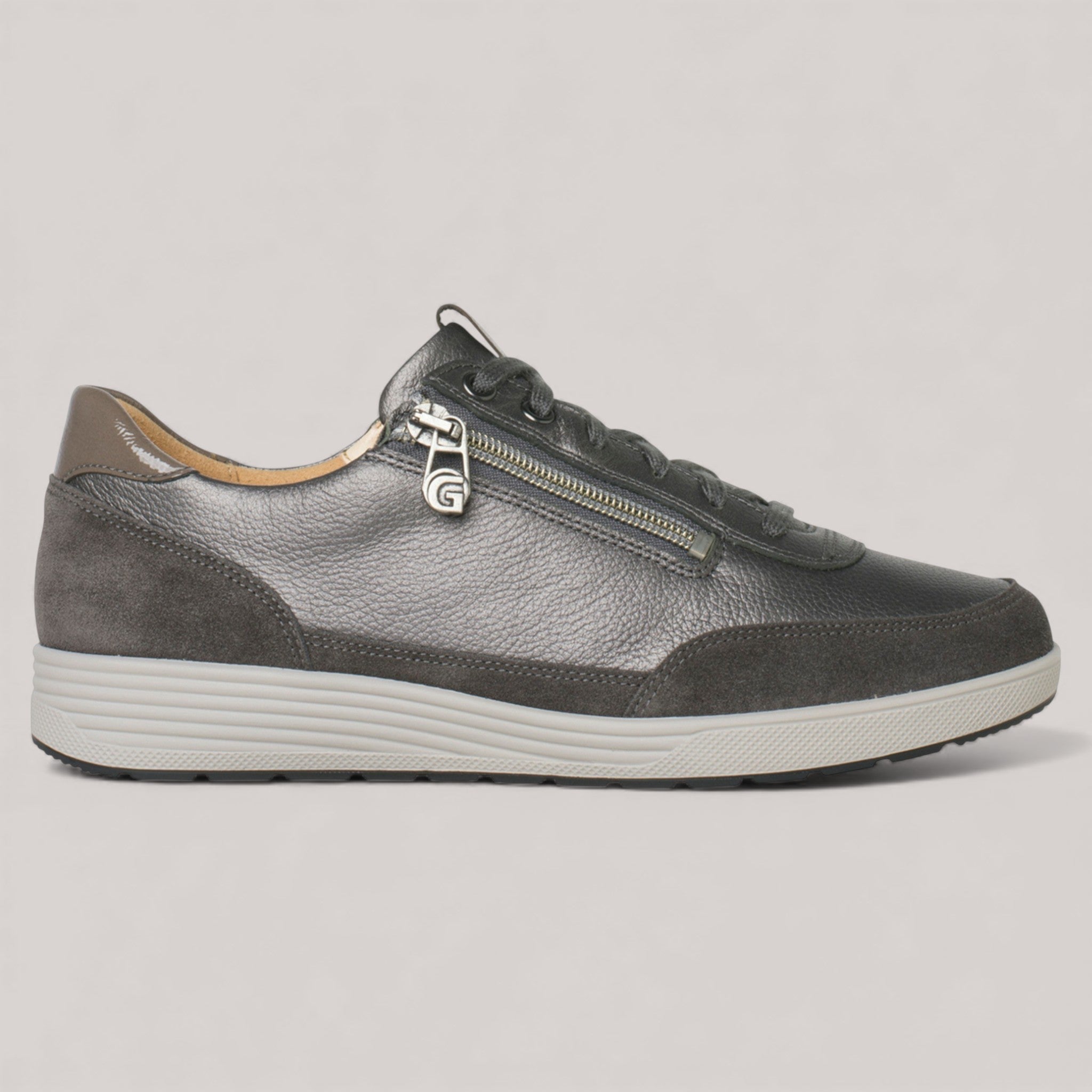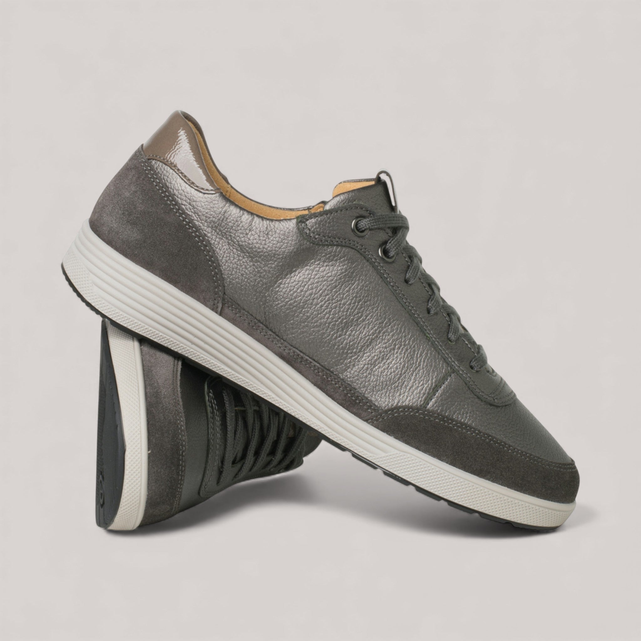 This shoe effortlessly blends sporty design with casual chic, creating the ultimate must-have sneaker. Crafted with luxurious metallic leather and suede applications, it offers a clean, flattering silhouette that pairs seamlessly with trousers, skirts, or leather jackets for a versatile look. The K width provides ample space for the foot to naturally expand, ensuring a comfortable fit for wider feet, while the tonal lacing and sleek side zip add sophisticated details and allow for easy wearability.