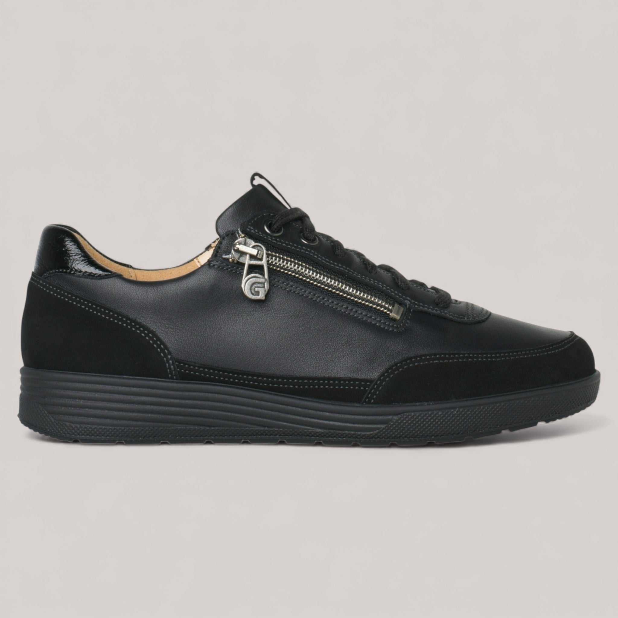 Sporty yet chic, this sneaker effortlessly combines luxury materials with fine details like tonal lacing and a sleek side zip. Designed with a K width, it offers plenty of room for the foot to naturally expand, while the clean, flattering silhouette gently showcases the foot. Crafted from smooth leather with nubuck leather accents, this versatile sneaker pairs perfectly with trousers, skirts, or a leather jacket. The dark, ribbed sole is lightweight and slip-resistant for added comfort. Part of the SENSITIV collection, it features GANTER's special lining with substantial padding, offering superior comfort. Silver-coated microfiber and fleece provide antibacterial benefits and enhance climate control. The VARIO cork footbed is removable, allowing for customization with your own insoles. The ideal choice for those seeking comfort and style, especially for wide feet!