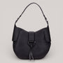 Discover understated elegance with this rounded hobo silhouette from HISPANITAS. Crafted in durable PU, it features a secure zipper closure, decorative magnetic strap, and adjustable shoulder carry. An internal zippered pocket keeps essentials organised, while the branded inner lining adds a refined touch. Compact yet spacious at 30cm W × 27cm H × 8cm D, it transitions effortlessly from day to evening.