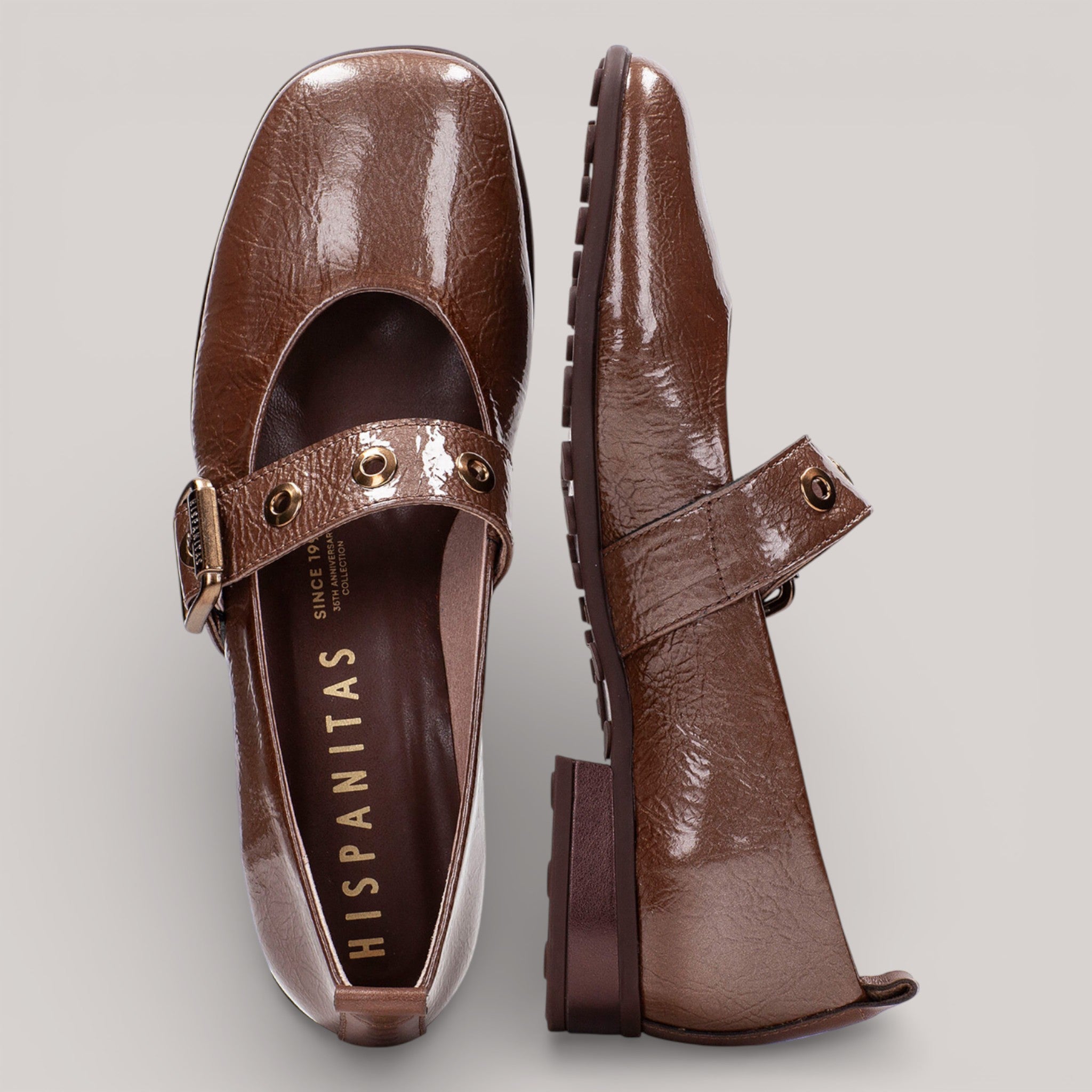HISPANITAS Genova pairs patent leather elegance with practical comfort. This Mary Jane features a squared toe, adjustable roller buckle strap, and a studded rubber sole with 2 cm heel. Triflow Technology provides triple padding for impact absorption, while the breathable, thermoregulating lining keeps feet comfortable throughout the day.