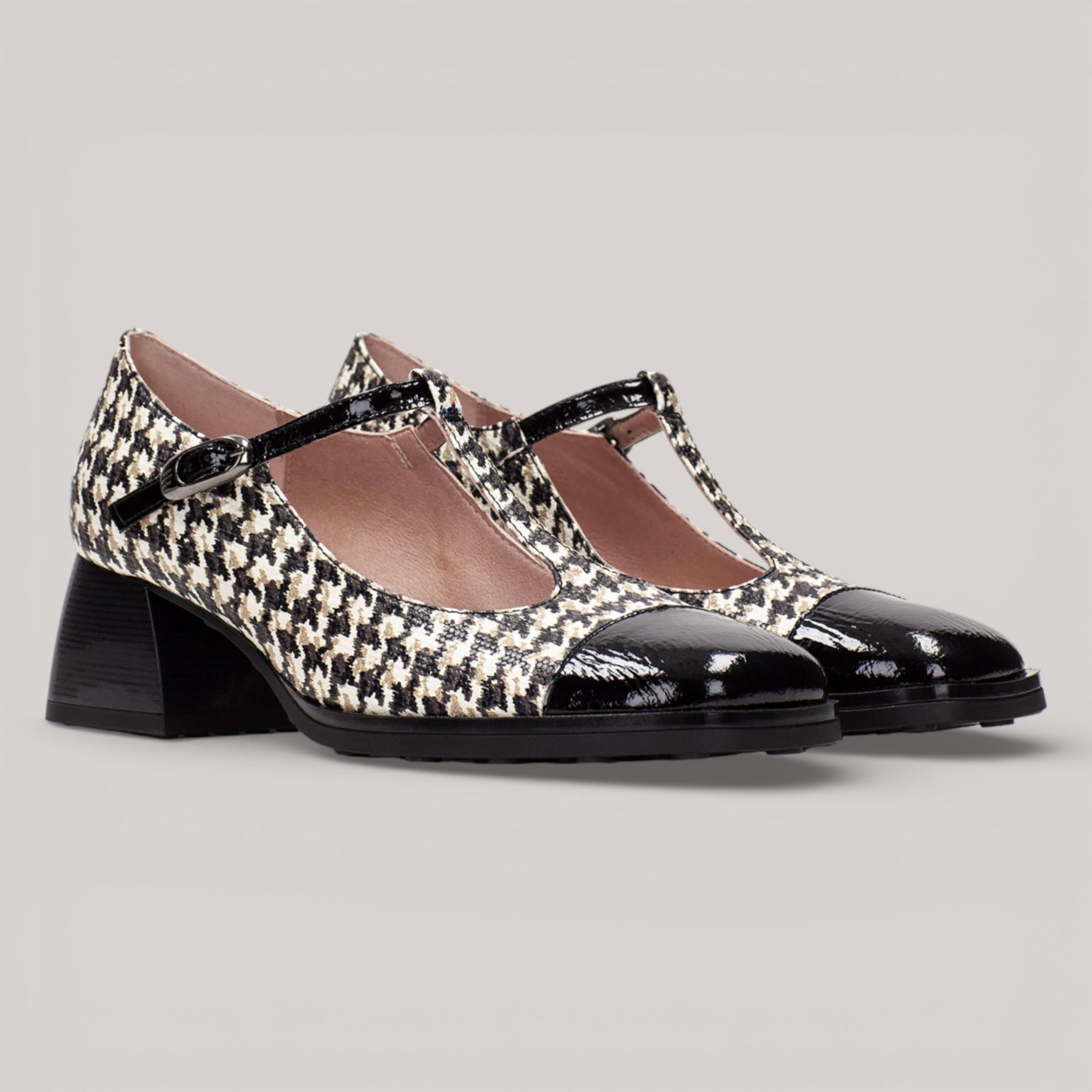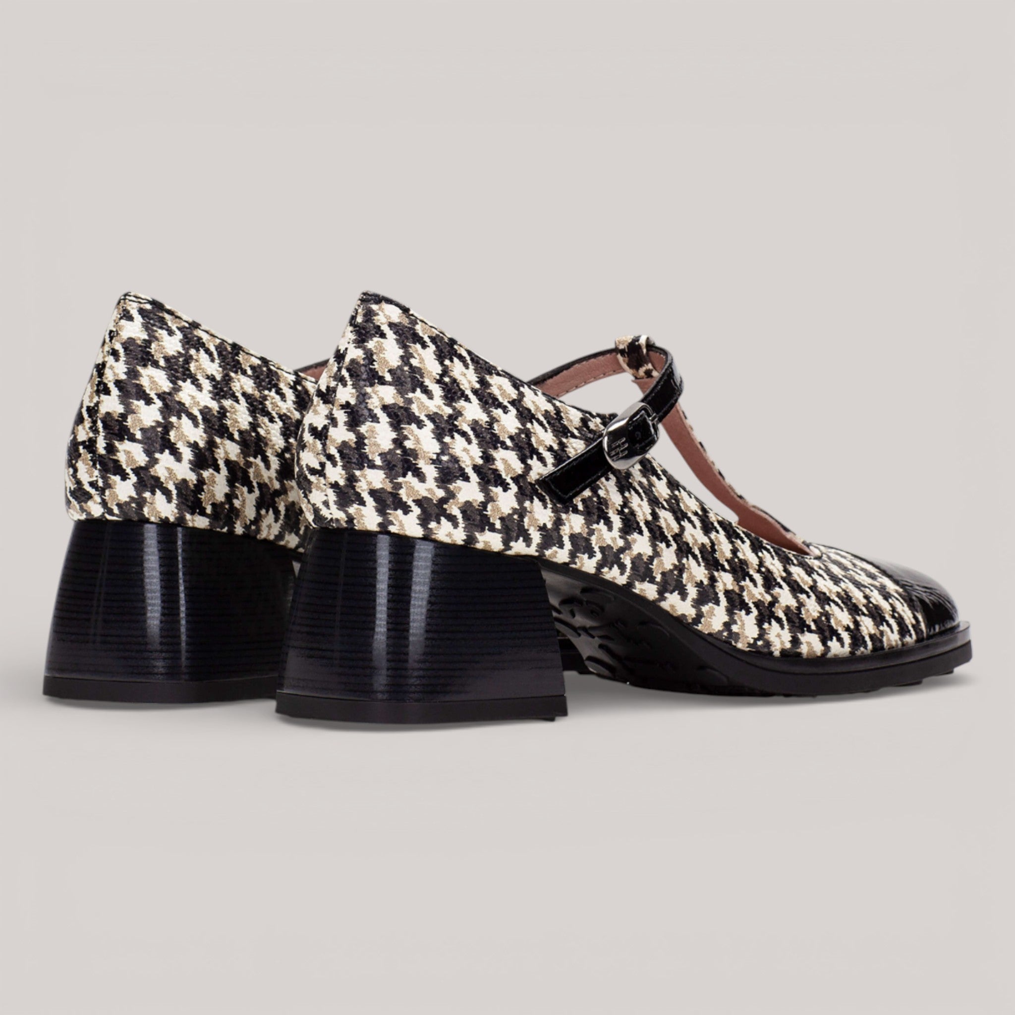 The HISPANITAS HI 254306 MARSELL pairs timeless elegance with modern comfort. This T-bar shoe features an adjustable buckle, square toe, and patent cowhide with tweed detailing. A studded rubber sole and 4.5 cm heel provide understated sophistication, while the breathable, thermoregulating lining keeps feet comfortable. Triflow Technology cushions every step with triple padding in the tread area.