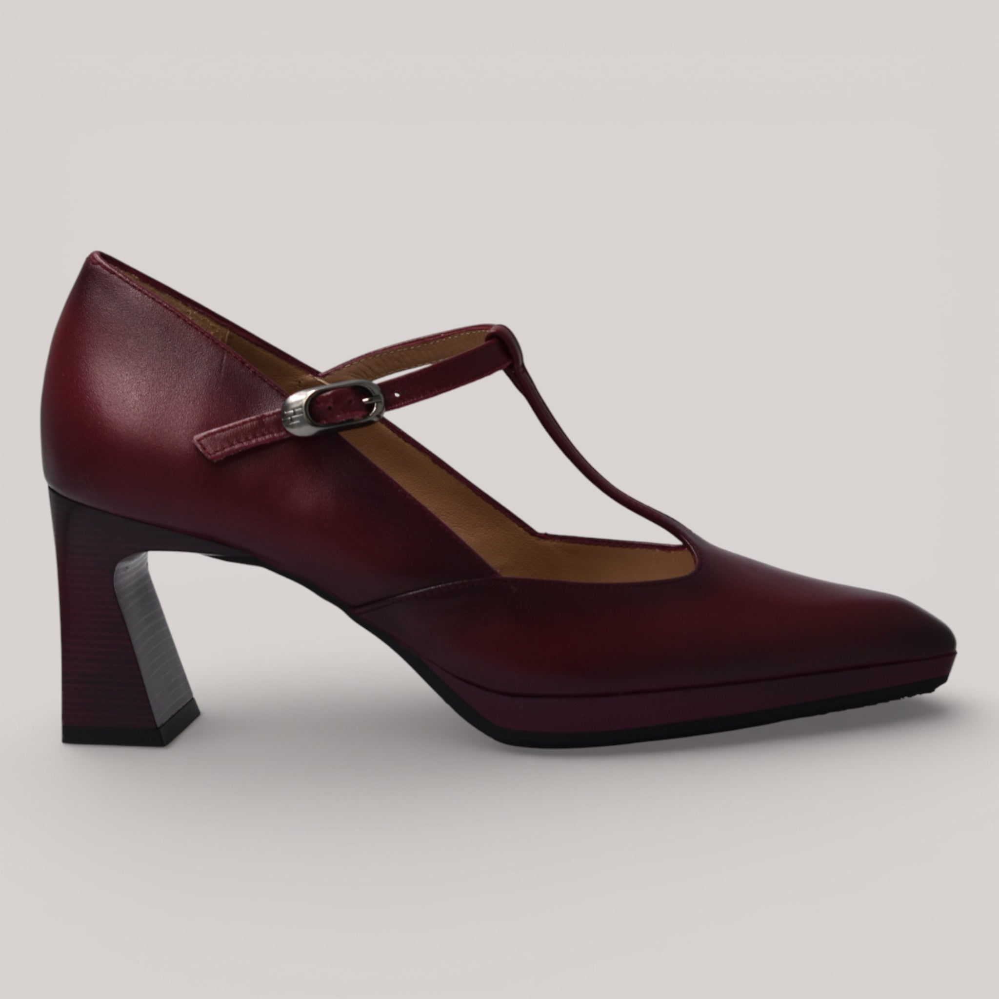 This T-bar shoe pairs a pointed toe with understated elegance. A 7 cm geometric heel in wood grain finish sits atop a lightweight 1 cm platform. Leather construction with leather lining and Triflow Technology—triple padding that absorbs impact for all-day comfort.