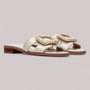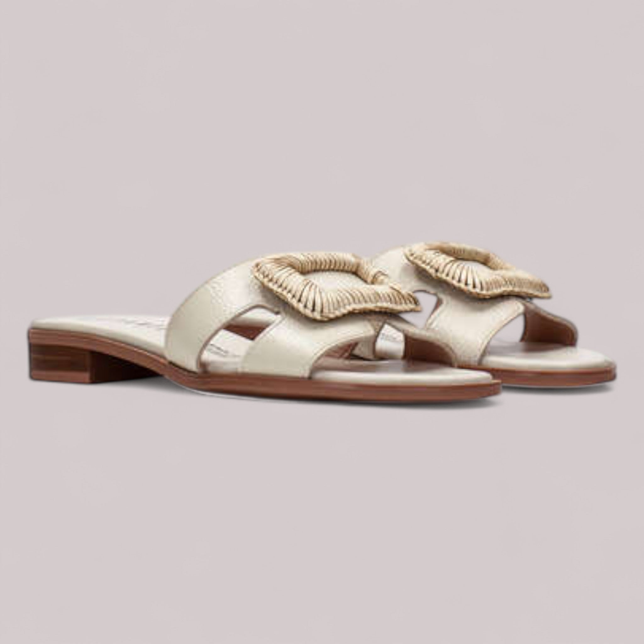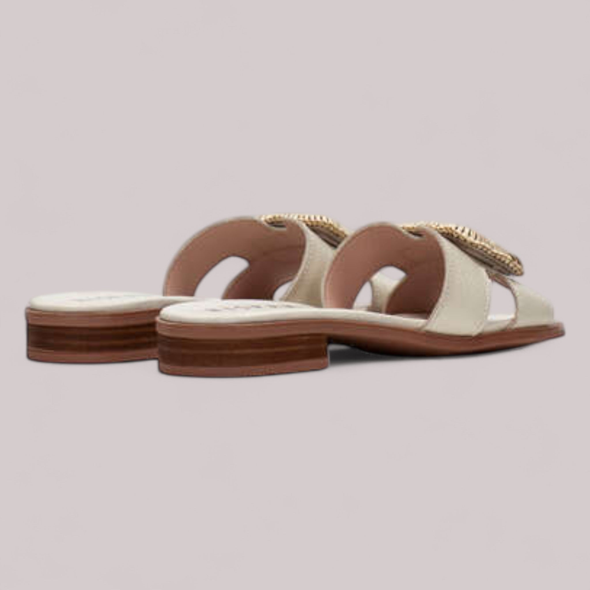 Embrace timeless elegance with this beautifully designed flat sandal, featuring hand-made decorative accents that add a unique artisanal touch. With a rounded toe and a 2.5 cm low sole, it offers a graceful silhouette and subtle lift for everyday wear.