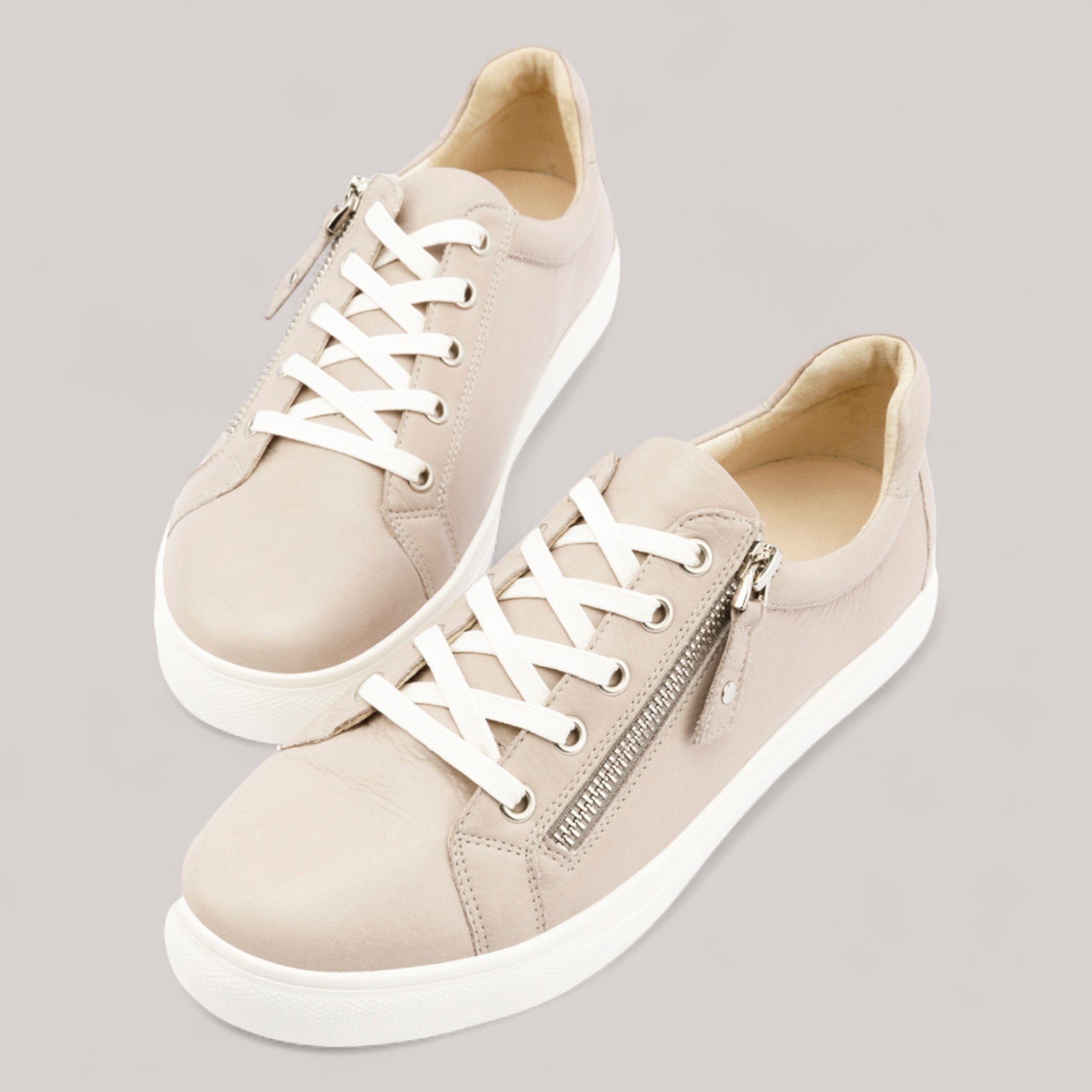 Crafted from breathable leather with printed side panels for added style, this shoe features a lace-up closure with a convenient side zip for easy on-off wear and a secure fit. Inside, a leather lining ensures an abrasion-free environment, while the padded removable insole provides extra comfort and accommodates orthotics. Finished with a flexible PU sole for durability and traction, this design is ideal for wider feet and all-day wear.