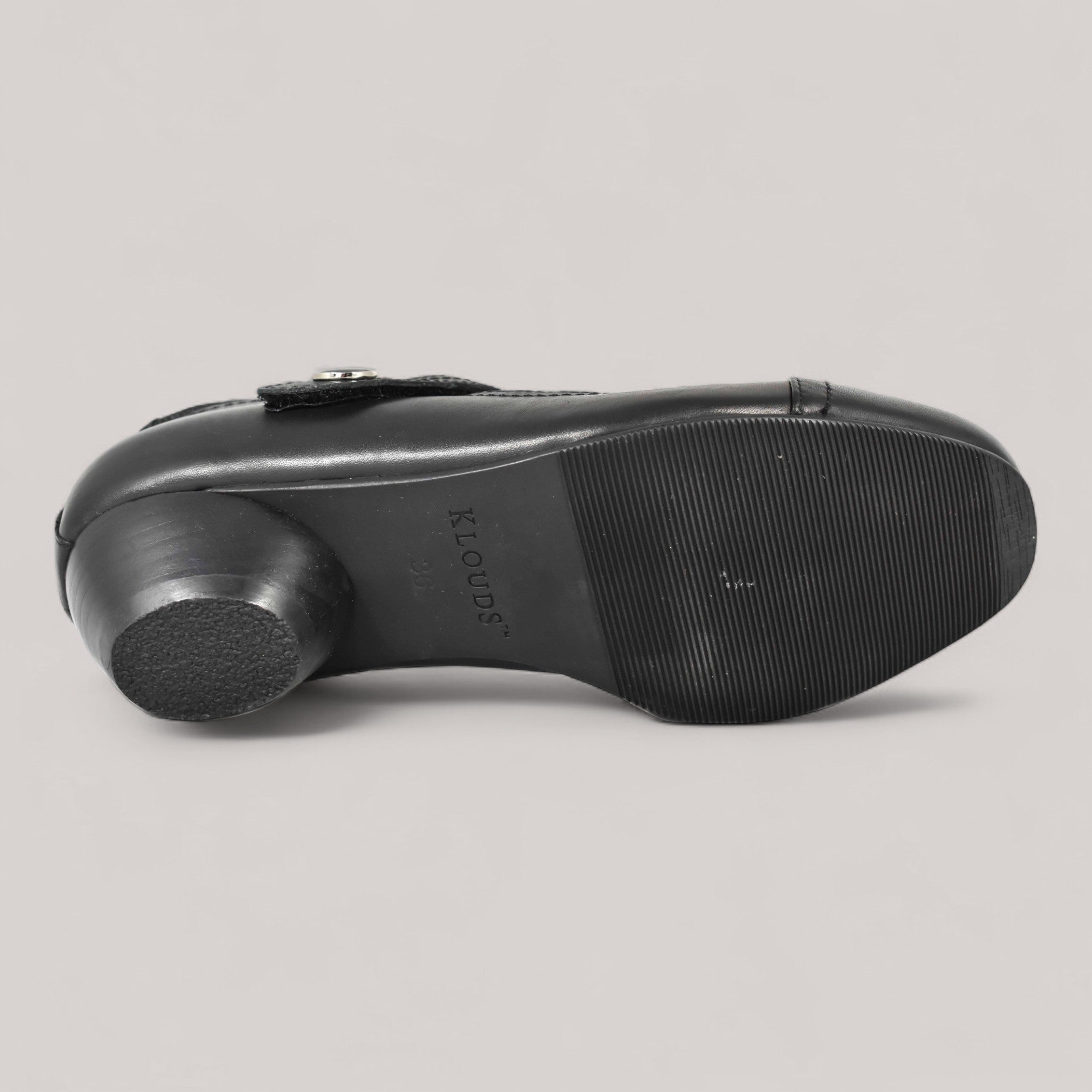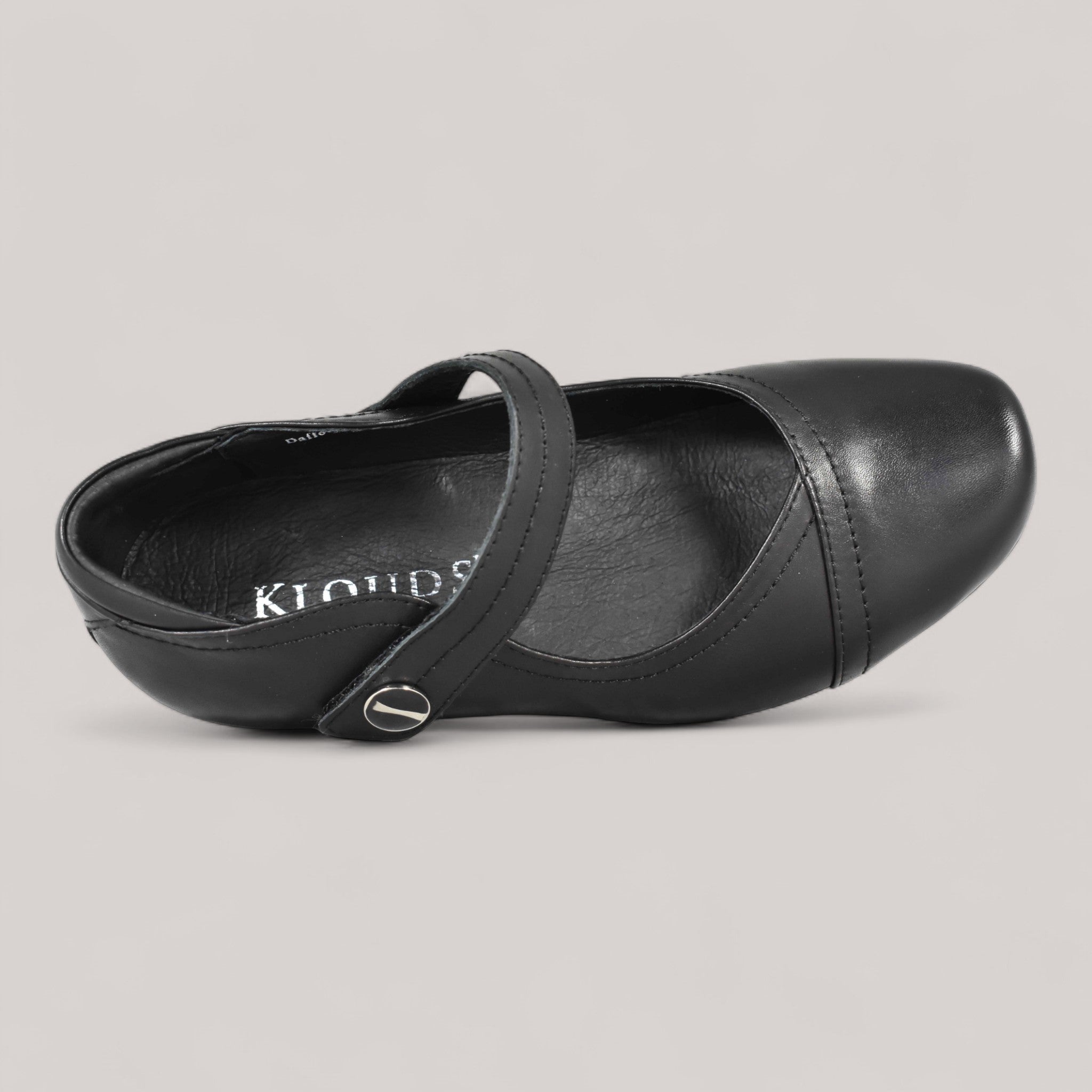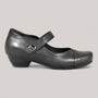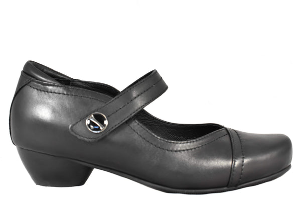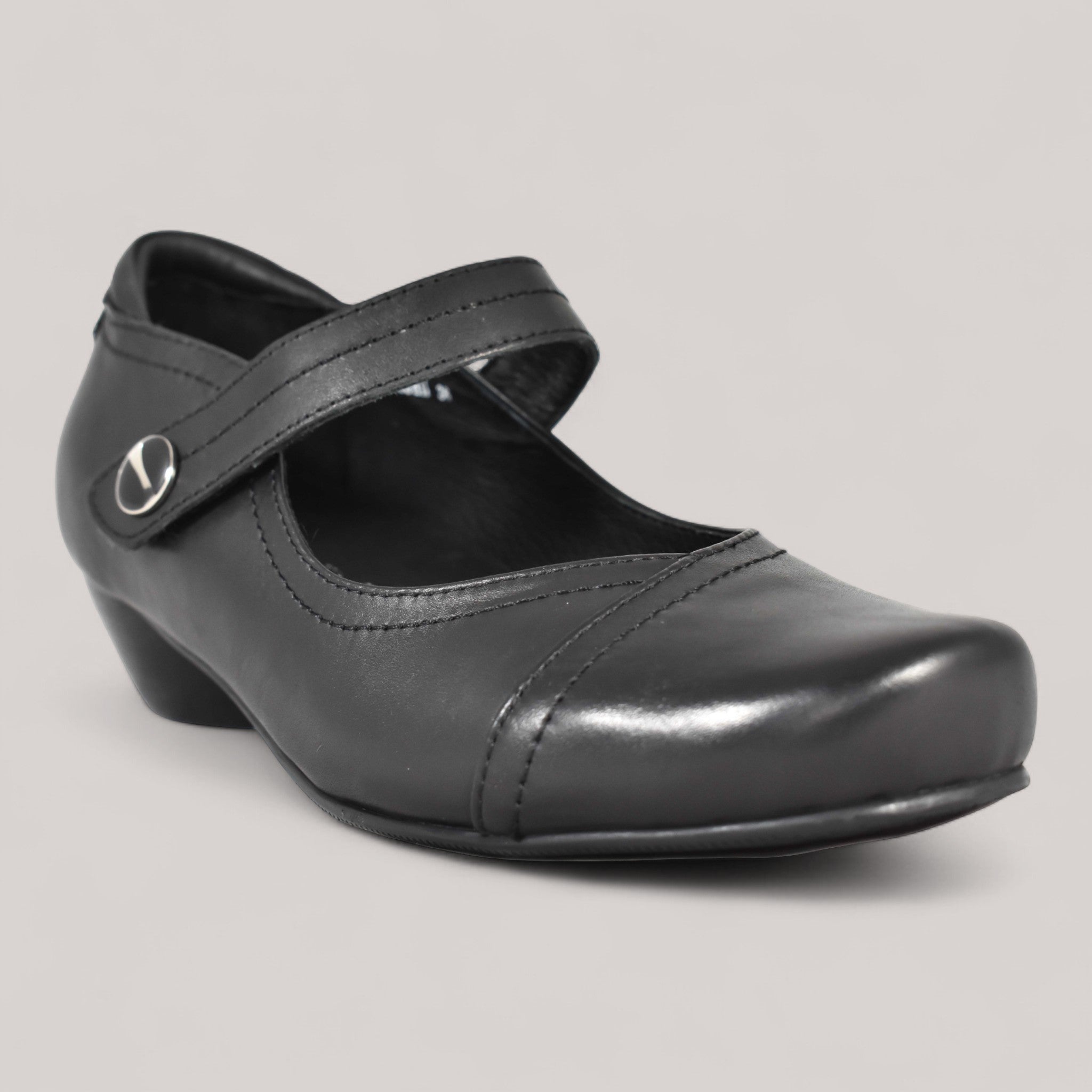 Crafted from breathable leather with a stylish button accent and padded collar for added comfort, this slip-on design features an adjustable Velcro Mary Jane strap for a secure fit. Inside, a leather lining creates an abrasion-free environment, while the removable leather-covered cushioned insole offers extra support and accommodates customised orthotics. A lightweight rubber sole provides flexibility, durability, and traction, complemented by a 4cm heel for subtle lift. Orthotic-friendly for all-day comfort.