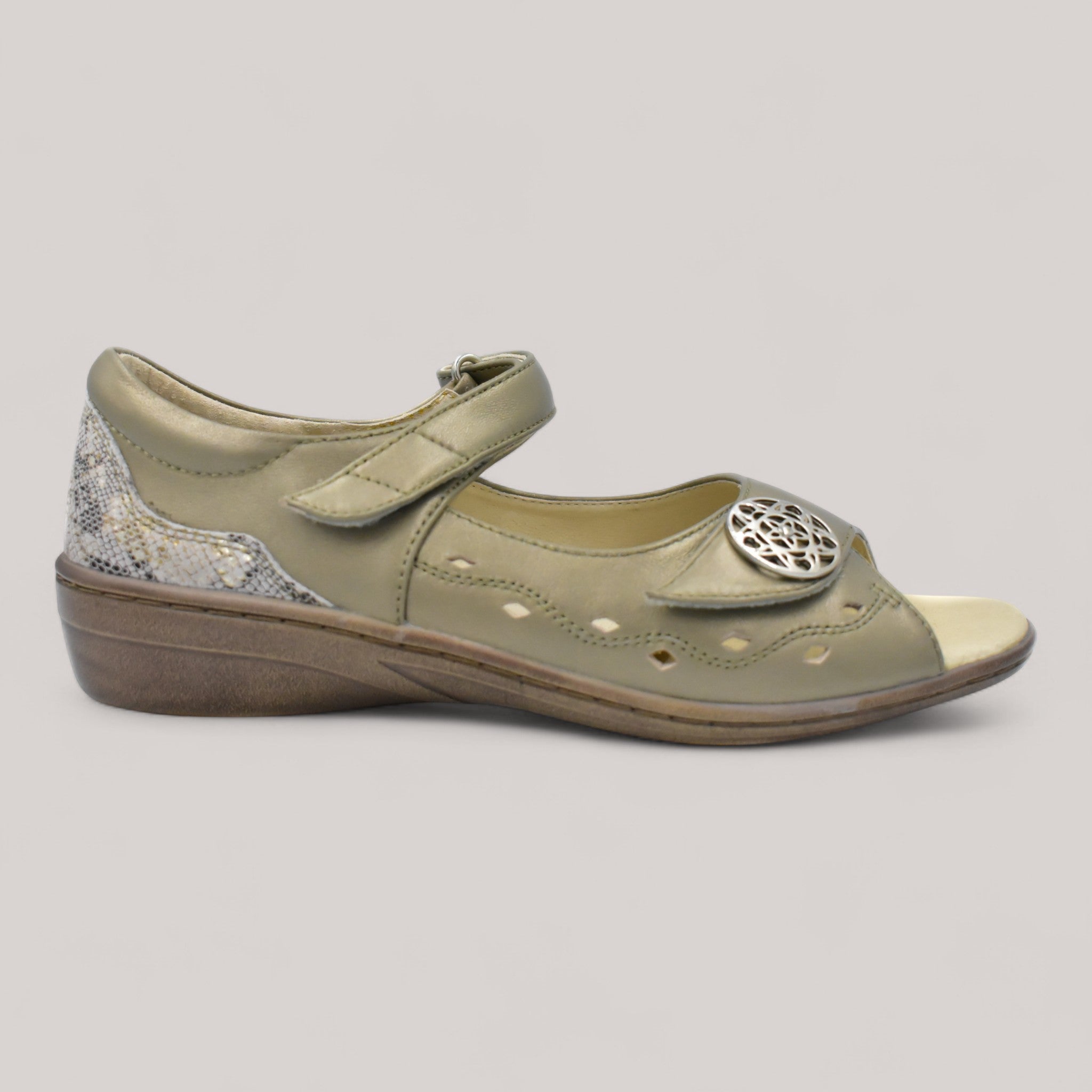 Leather upper for breathability with button accent for added interest. Slip on closure with two adjustable velcro straps for easy on-off wear. Leather lining for an abrasion-free environment for all-day wear. Removable leather-covered, cushioned insole for superior comfort. Cushioned midsole with velcro attachments for ease of personal orthotic use. Stabilising shank for extra support and stability. Lightweight cushioned PU sole for flexibility and traction on a variety of surfaces.