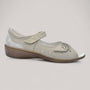 Leather upper for breathability with button accent for added interest. Slip on closure with two adjustable velcro straps for easy on-off wear. Leather lining for an abrasion-free environment for all-day wear. Removable leather-covered, cushioned insole for superior comfort. Cushioned midsole with velcro attachments for ease of personal orthotic use. Stabilising shank for extra support and stability. Lightweight cushioned PU sole for flexibility and traction on a variety of surfaces.