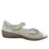 Leather upper for breathability with button accent for added interest. Slip on closure with two adjustable velcro straps for easy on-off wear. Leather lining for an abrasion-free environment for all-day wear. Removable leather-covered, cushioned insole for superior comfort. Cushioned midsole with velcro attachments for ease of personal orthotic use. Stabilising shank for extra support and stability. Lightweight cushioned PU sole for flexibility and traction on a variety of surfaces.