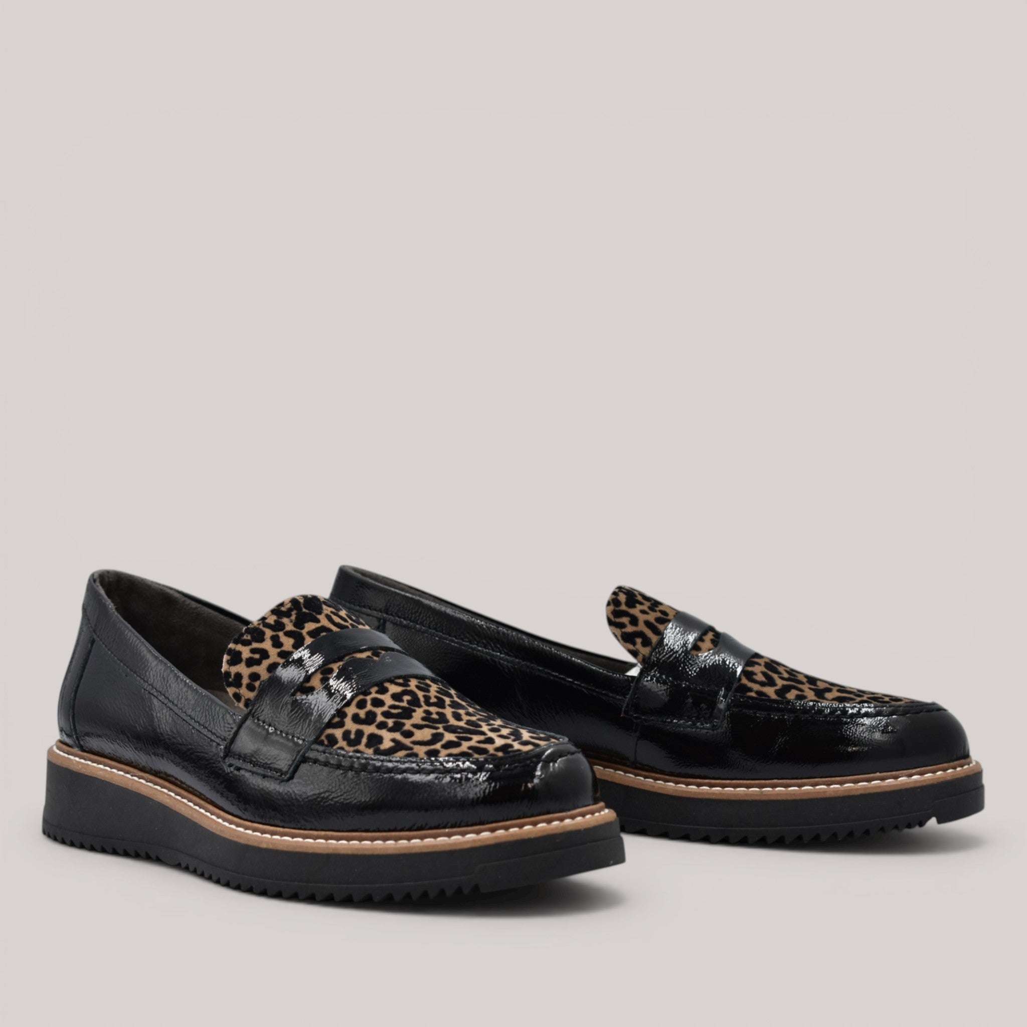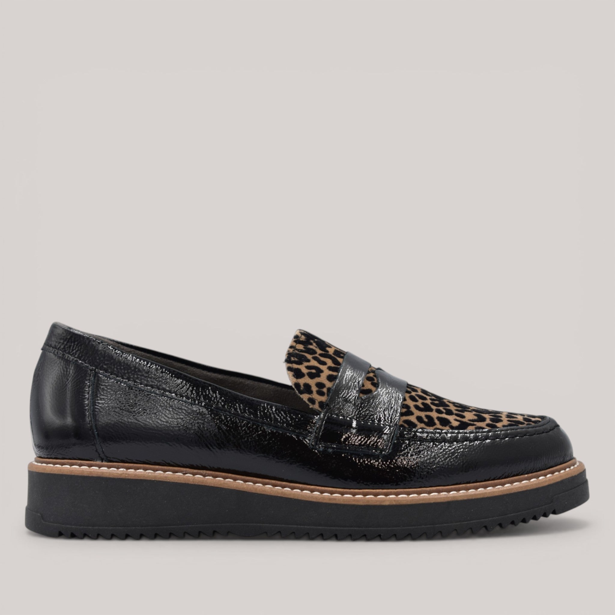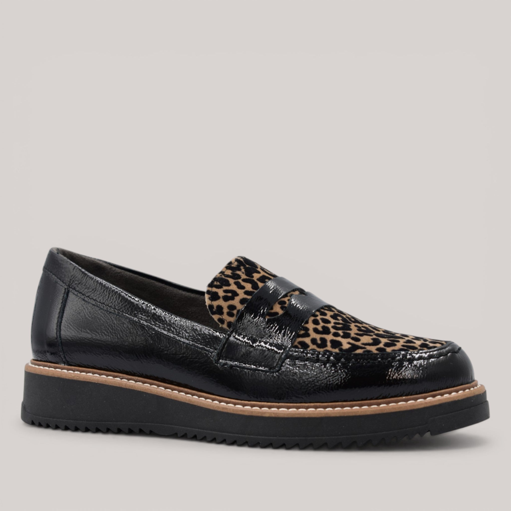 Patent leather with timeless elegance in this classic women's penny loafer, reimagined with a bold leopard print twist. The structured silhouette delivers everyday sophistication, while an orthotic-friendly design ensures all-day comfort without compromise. Perfect for those who refuse to choose between style and support.