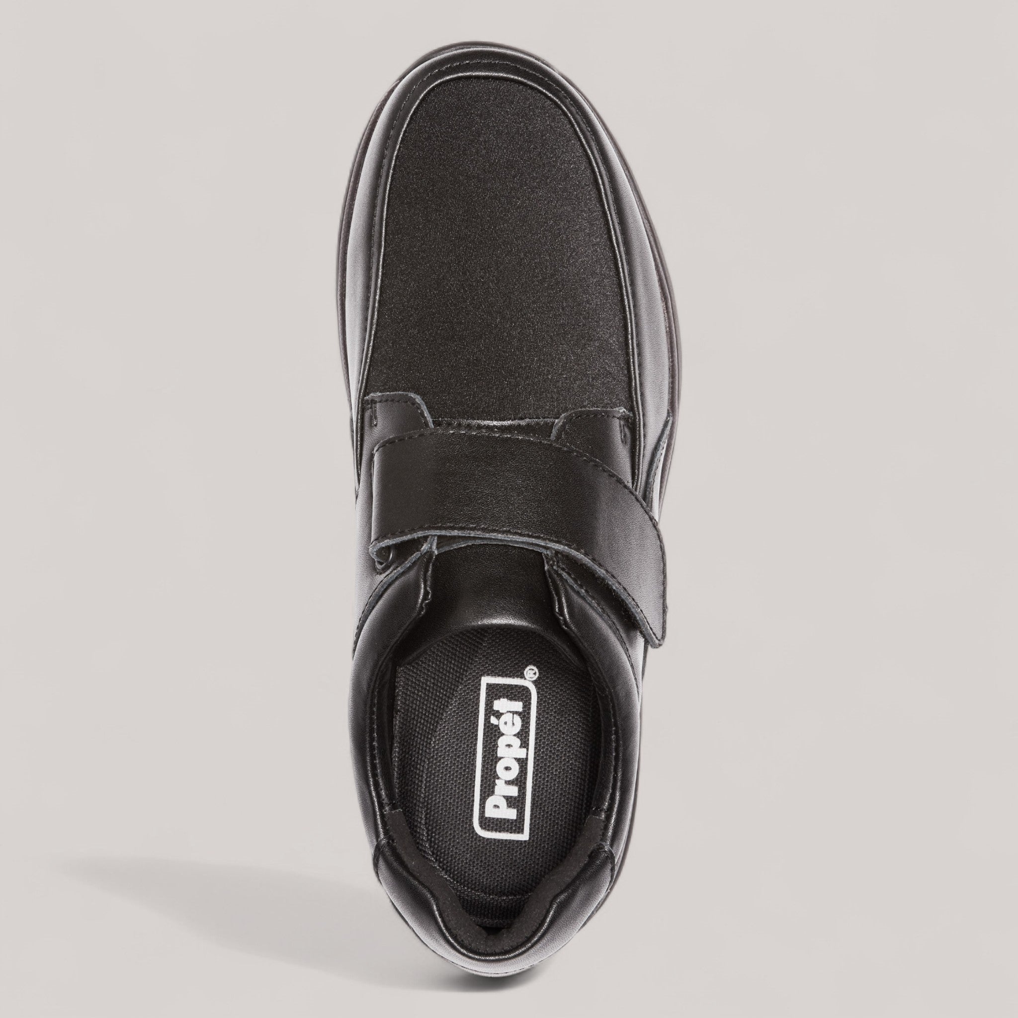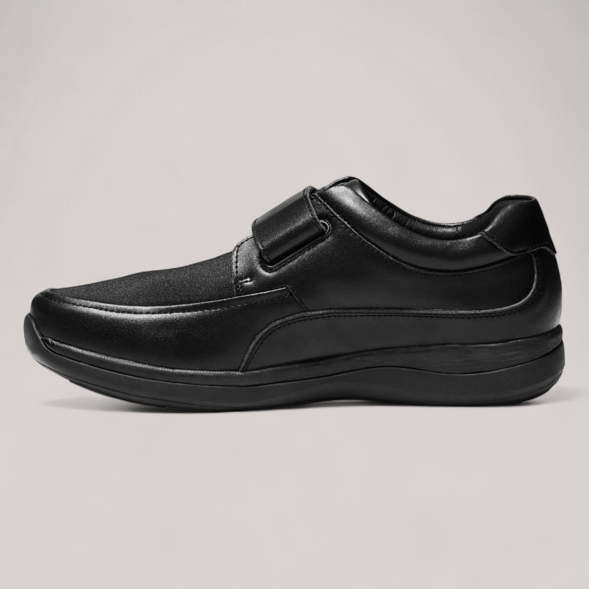 This shoe features a flexible Neoprene® vamp upper with a leather counter for a moulded fit, complemented by a padded collar and tongue for added comfort. A supportive leather band and roomy toe box enhance ease of wear, while the slip-on design with adjustable Velcro strap ensures convenience. Inside, a leather lining creates an abrasion-free environment, and an internal heel counter with a fibreglass shank adds rigidity. The removable Poliyou® insoles promote air circulation and help prevent odour, while the lightweight polyurethane sole offers durability and cushioning. Orthotic-friendly and potentially diabetic-friendly depending on individual fitting needs.