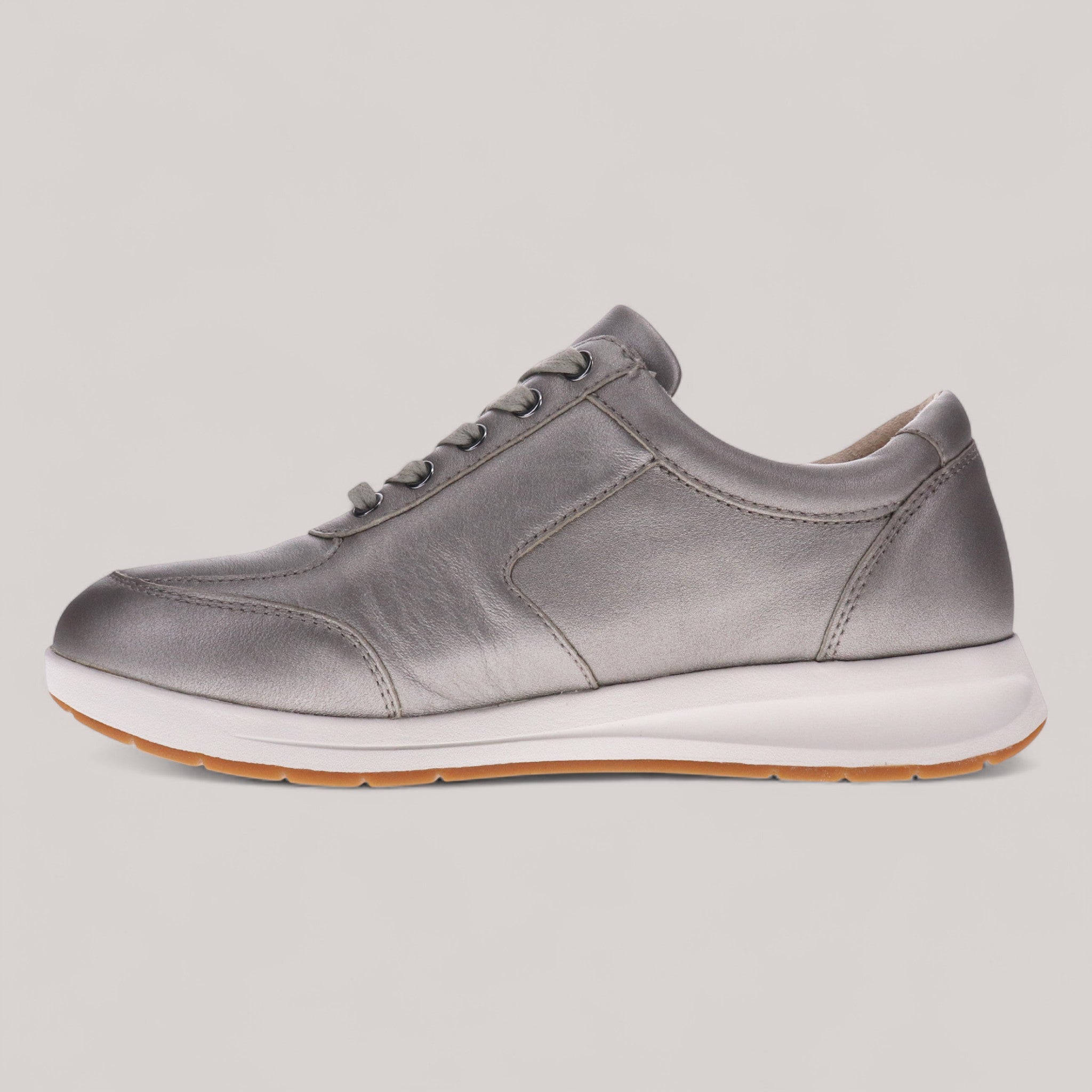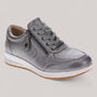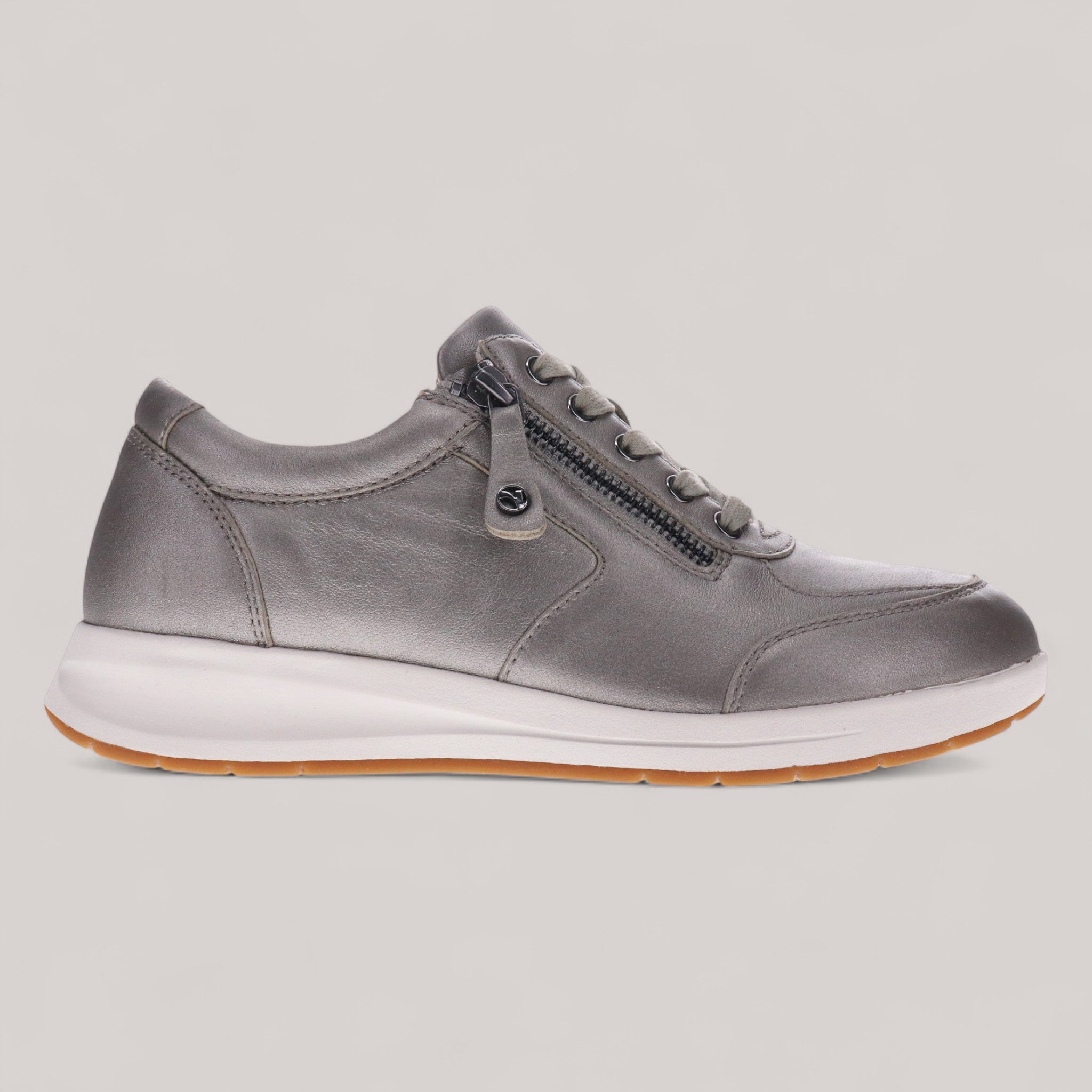 Leather upper for breathability with metallic finish. Leather lining for an abrasion free environment and all day wear. Side zip and adjustable laces for a secure, personalised fit. Revere metal branding for luxe detail. Removable, padded insoles for superior comfort. Slip resistant sole for durability and traction on a variety of surfaces.