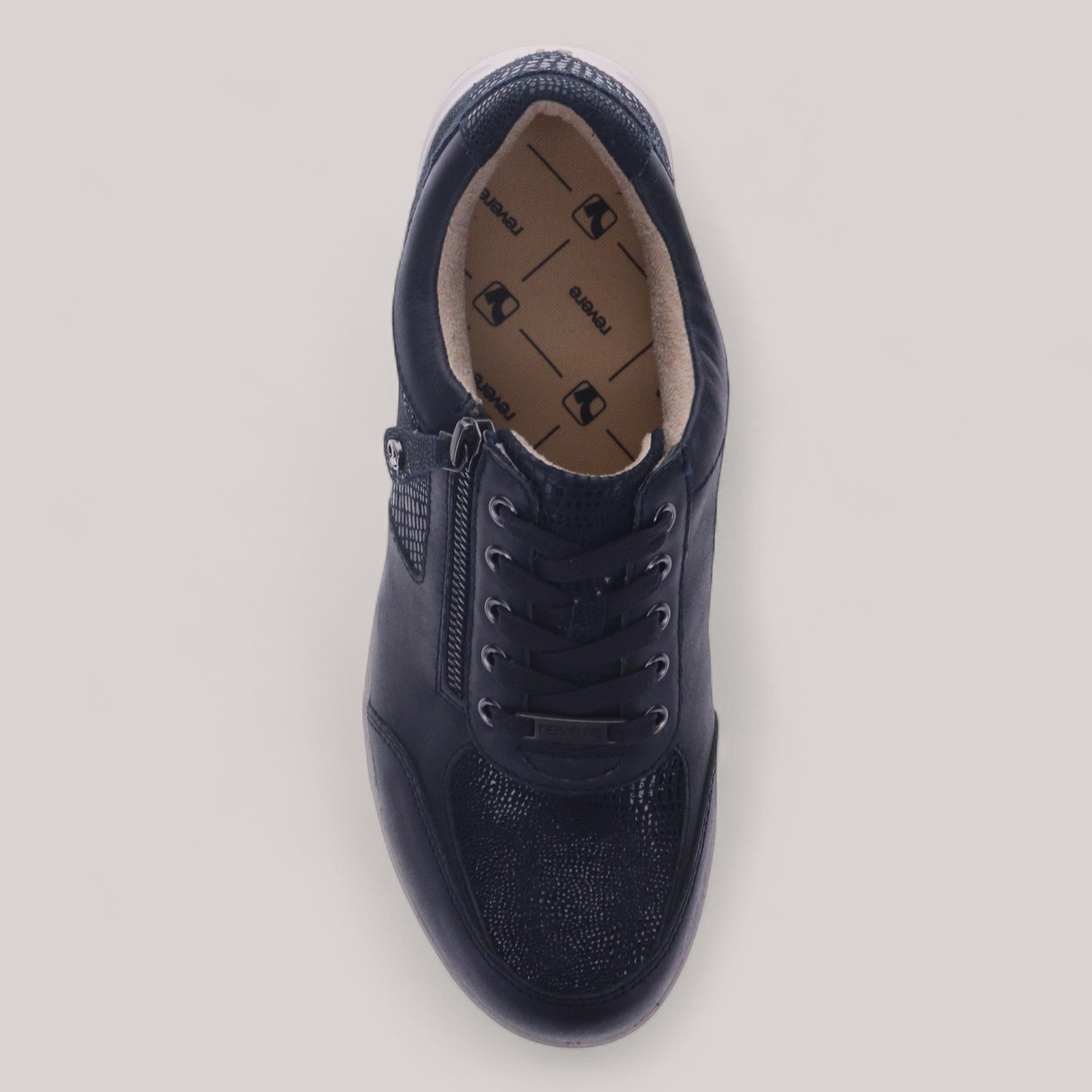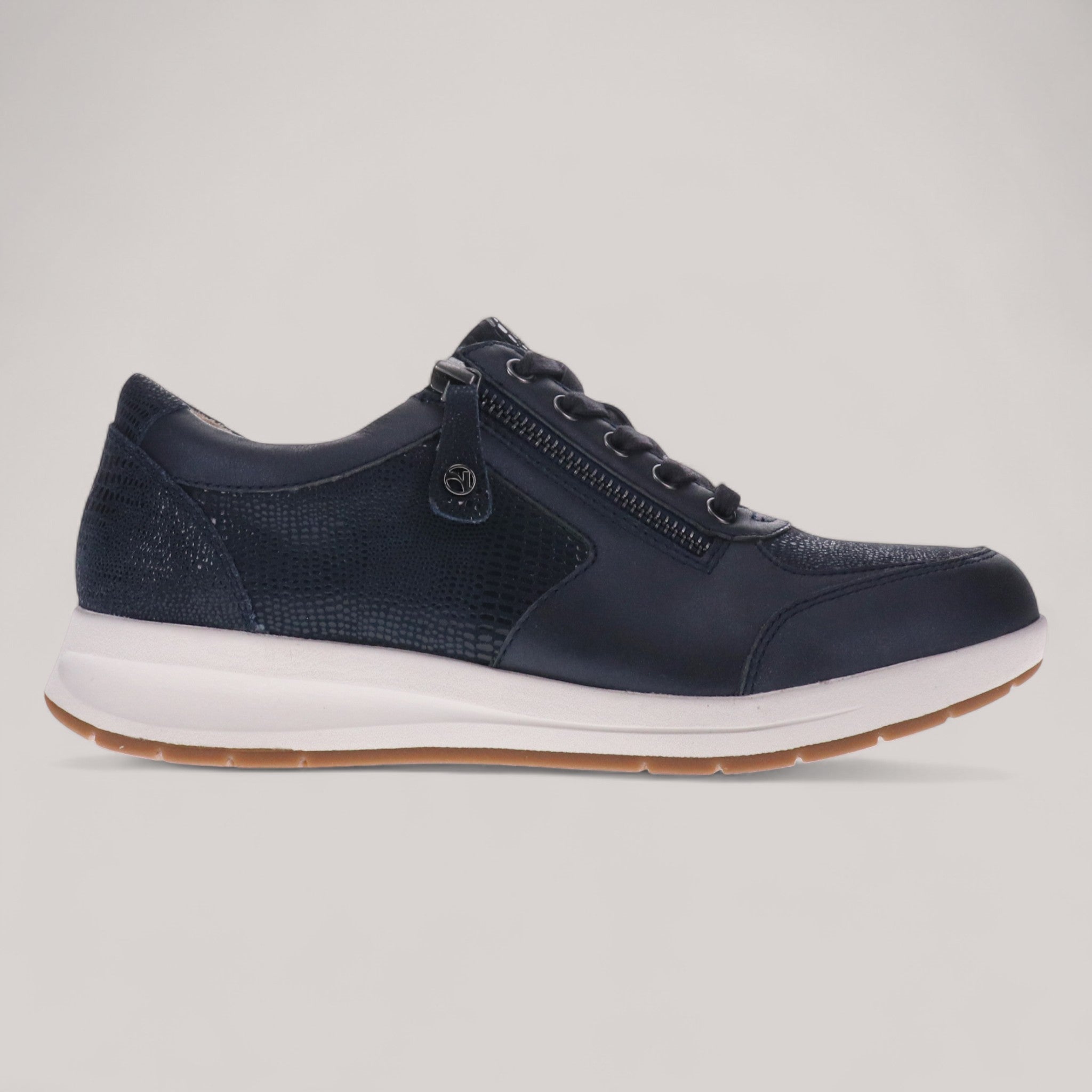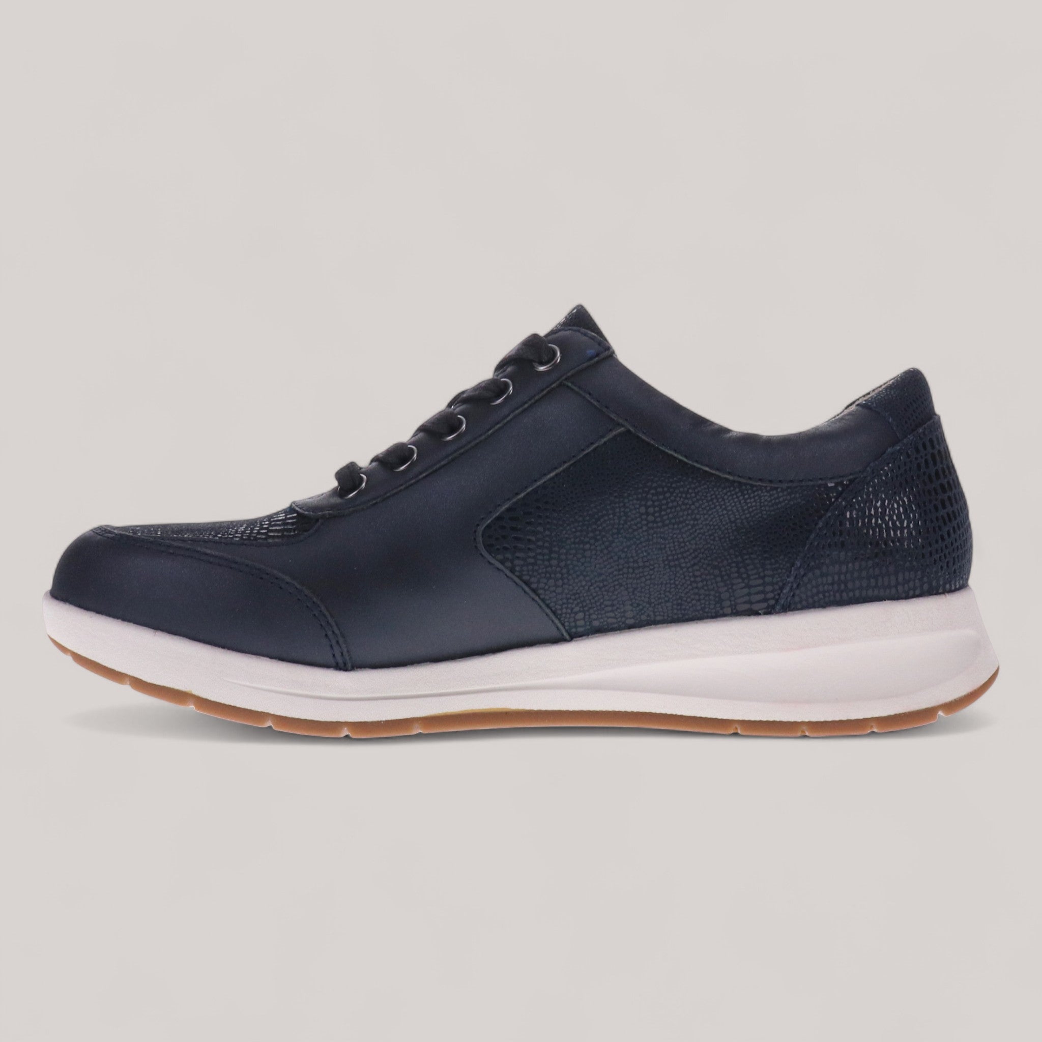 Leather upper for breathability, croc style pattern with navy patent for added design and style. Leather lining for an abrasion free environment and all day wear. Side zip and adjustable laces for a secure, personalised fit. Revere metal branding for luxe detail. Removable, padded insoles for superior comfort. Slip resistant sole for durability and traction on a variety of surfaces.