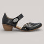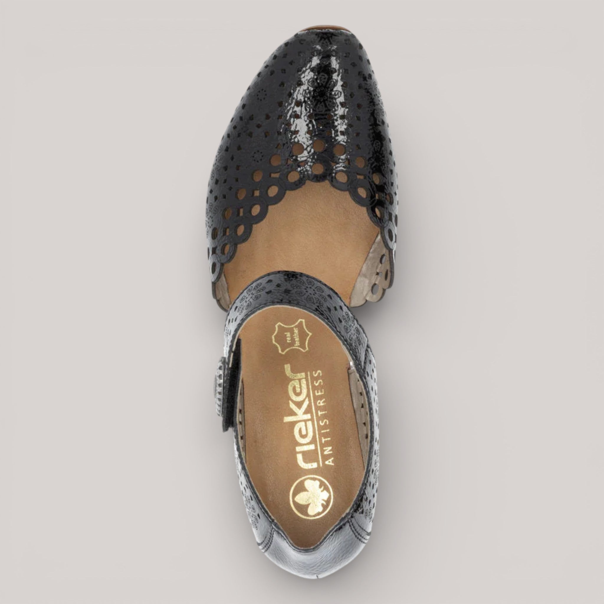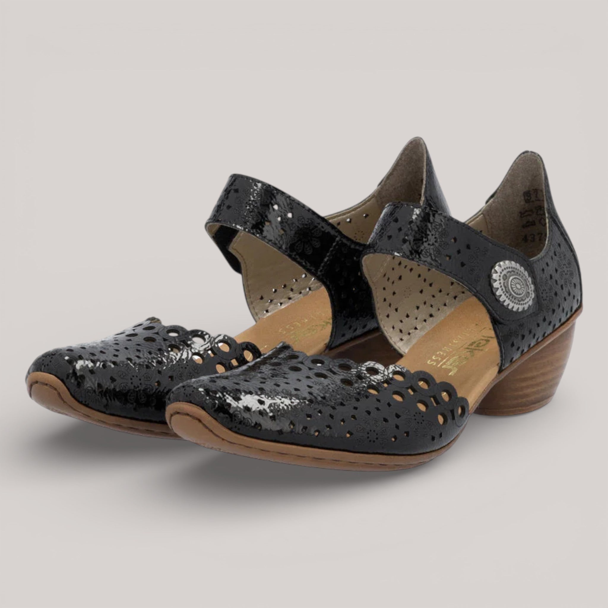 This elegant low-heeled shoe slips on easily for both casual and dressy occasions, with an adjustable ankle strap for a tailored fit. Featuring a unique all-over laser-cut design, it’s crafted from quality leather and set on a 1.6" RIRICON sole for subtle lift and comfort.