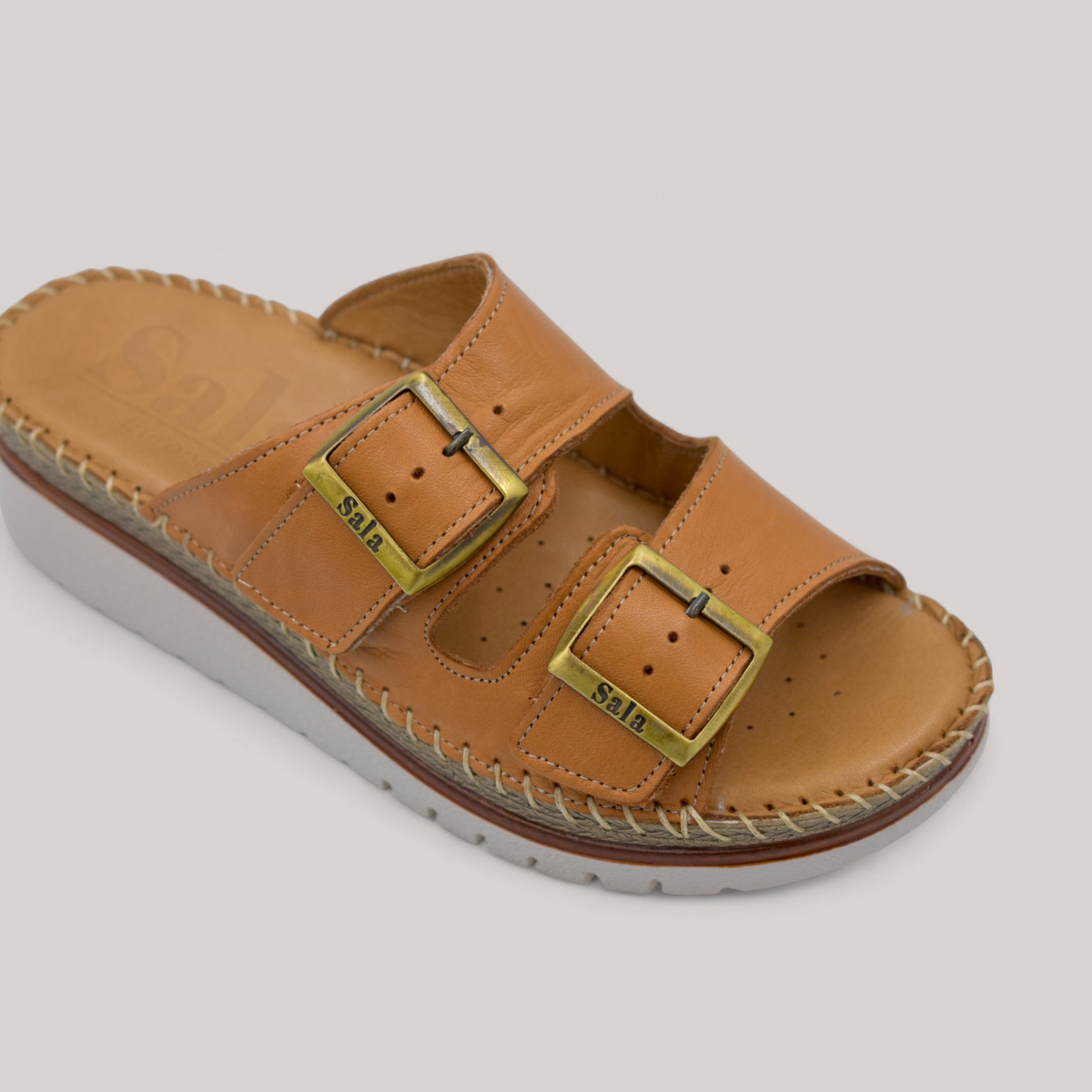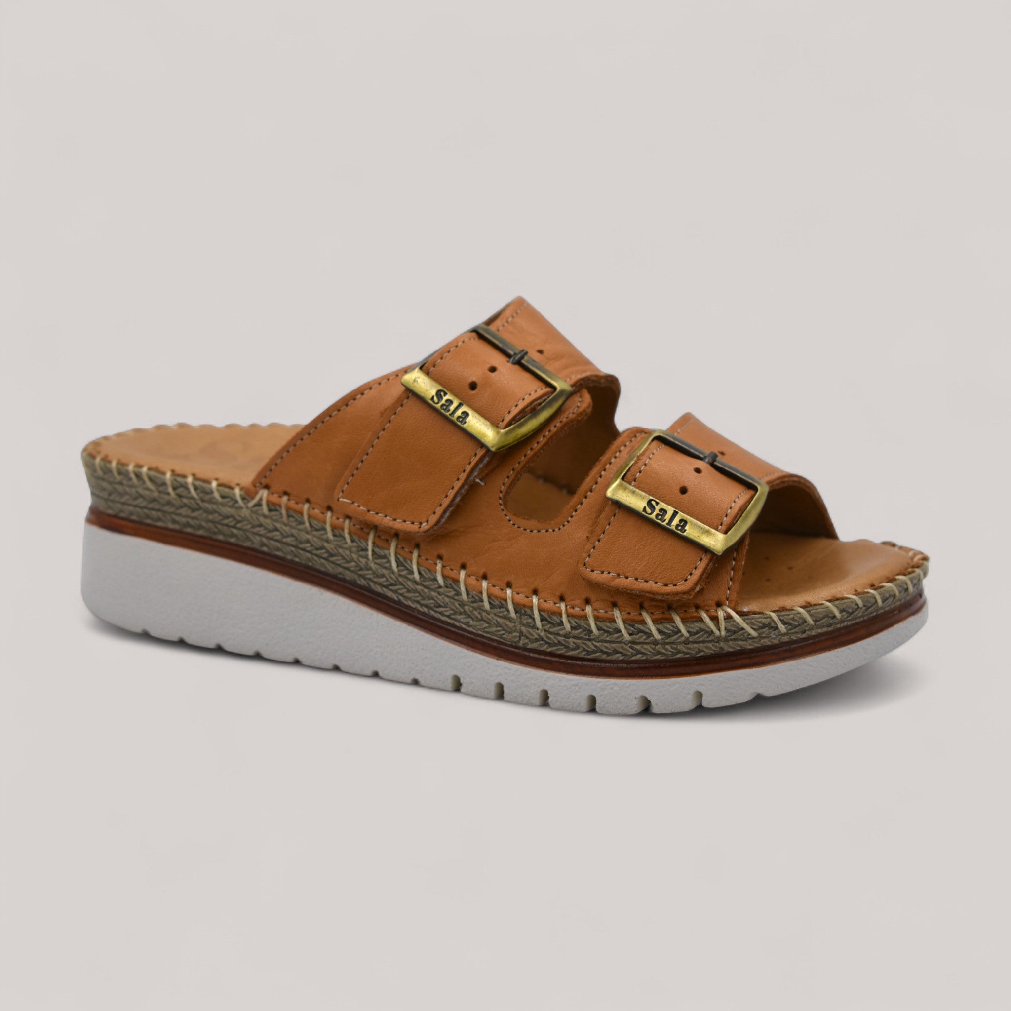 Crafted with a premium leather upper and lining, the Sala - Oasis features a sleek two-strap slide design for effortless style. Its padded insole ensures lasting comfort, while the 4.5cm wedge subtly elevates your posture. Expertly made in Turkey, this footwear blends quality craftsmanship with sophisticated comfort.