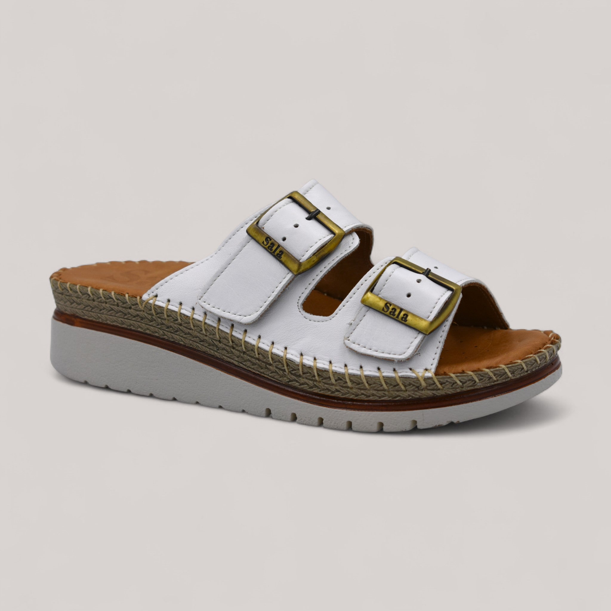 Crafted with a premium leather upper and lining, the Sala - Oasis features a sleek two-strap slide design for effortless style. Its padded insole ensures lasting comfort, while the 4.5cm wedge subtly elevates your posture. Expertly made in Turkey, this footwear blends quality craftsmanship with sophisticated comfort.
