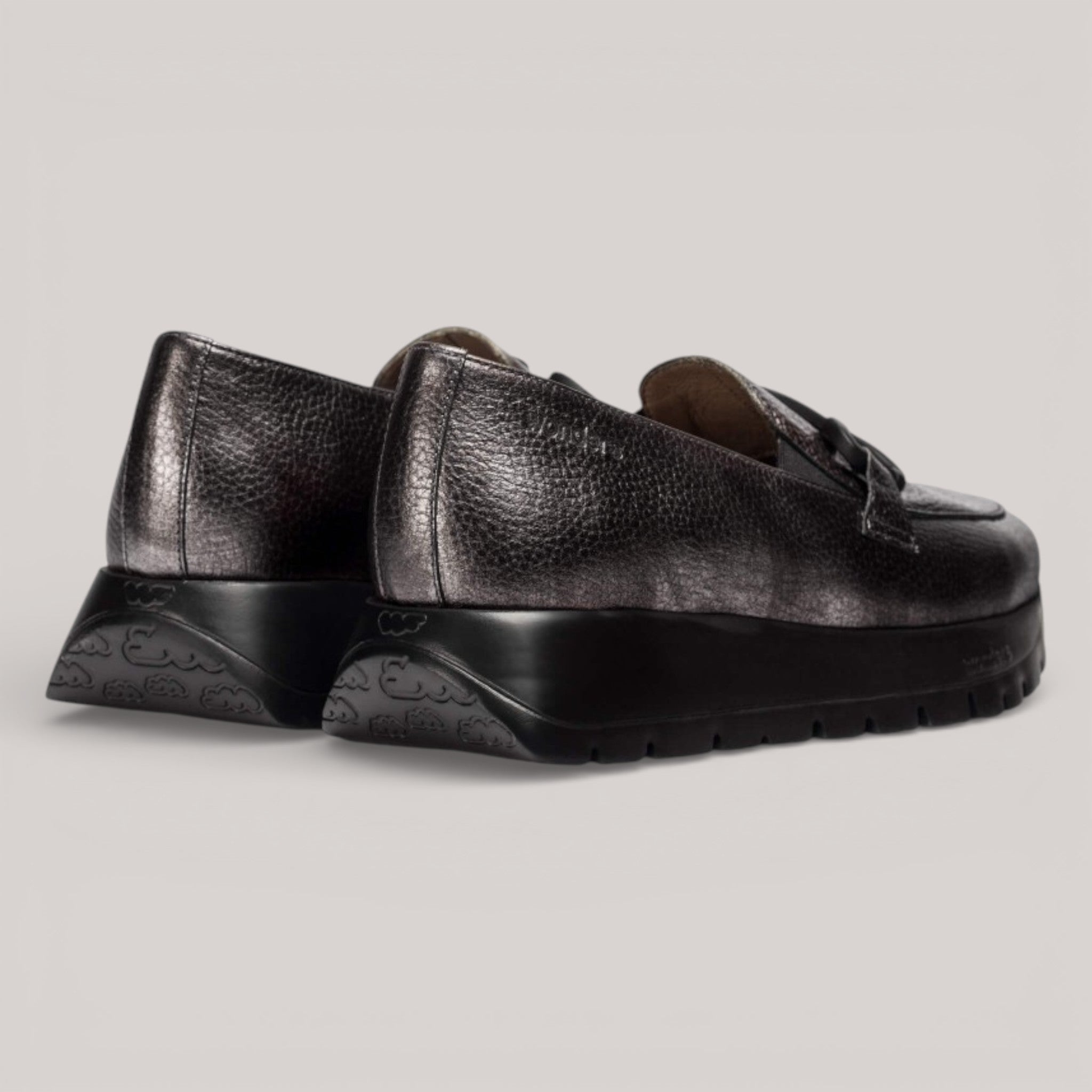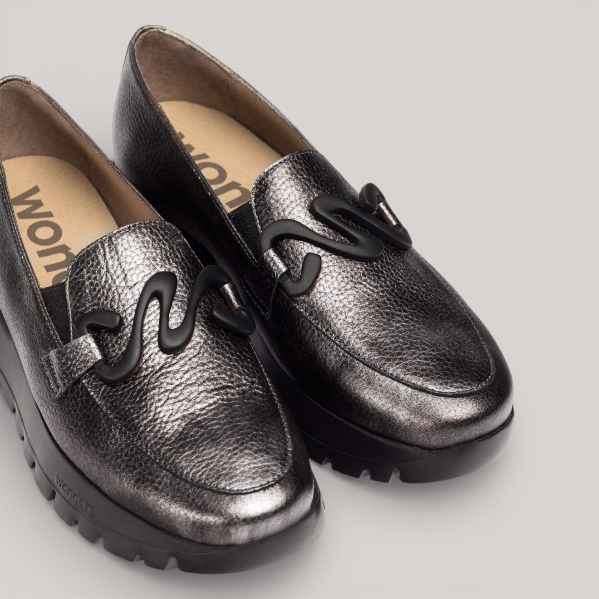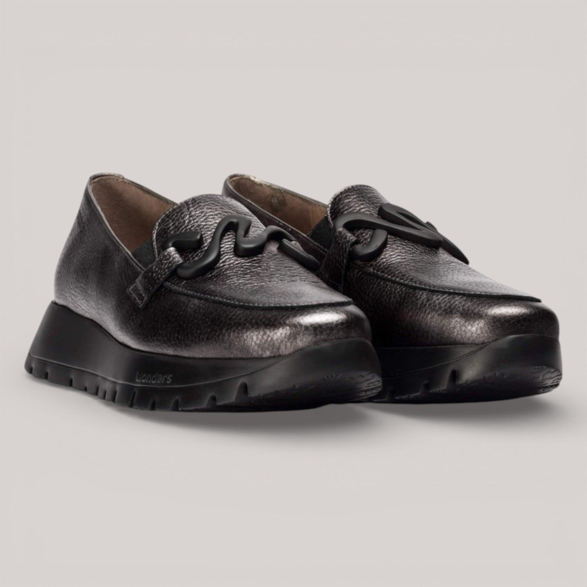 Crafted in lustrous metallic lead leather, this penny loafer channels timeless elegance with a refined decorative buckle. The innovative WondersFly™ sole delivers remarkable lightness without compromising support, while the removable MemoryGel insole moulds to your foot's contours for sustained comfort throughout the day. A sophisticated choice for those who value both style and wearability.