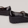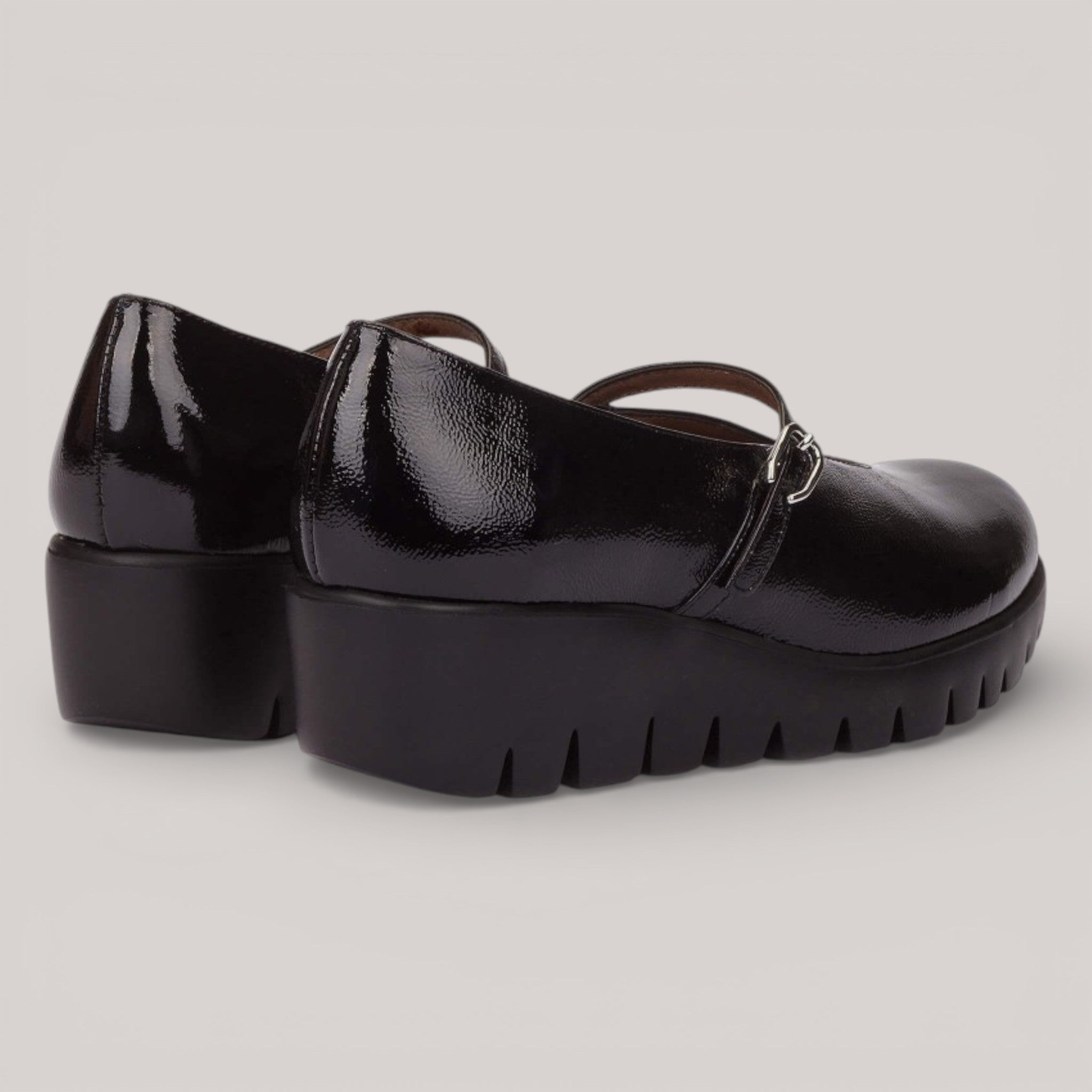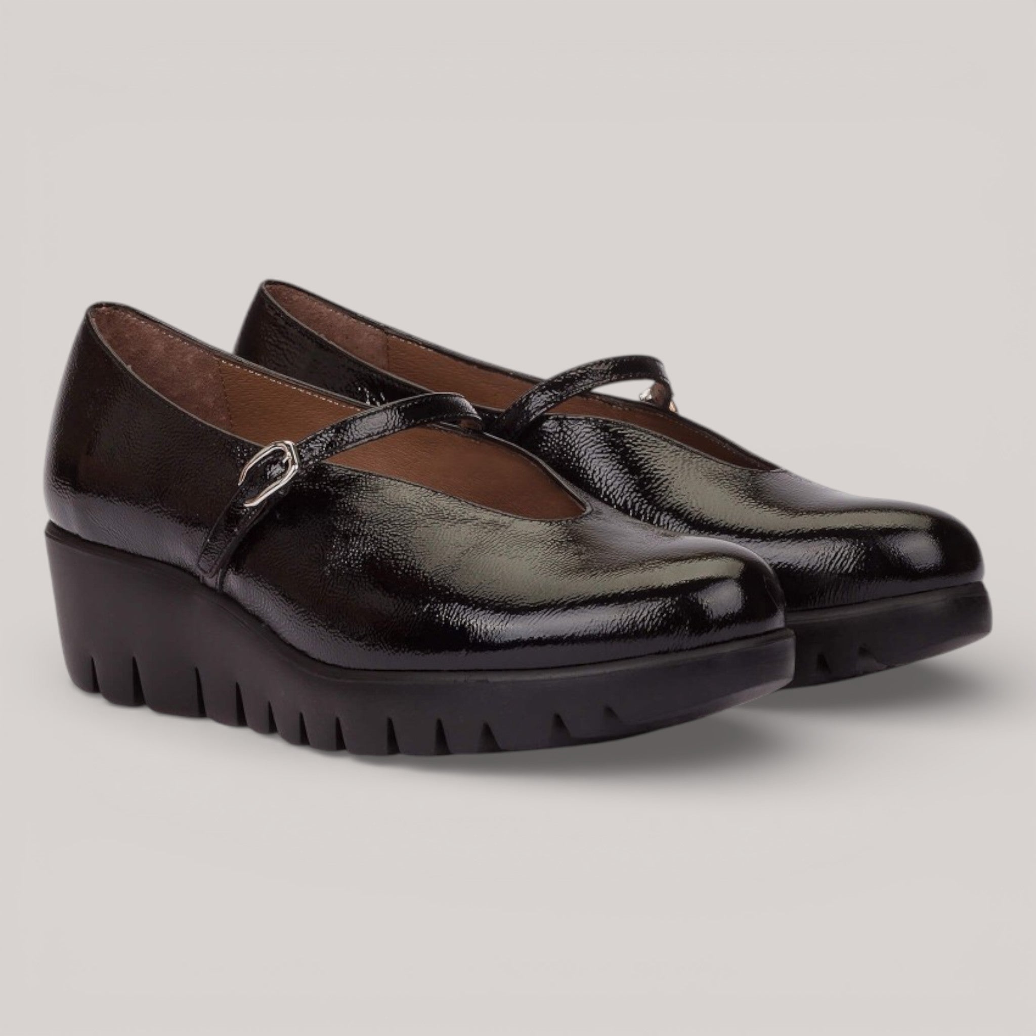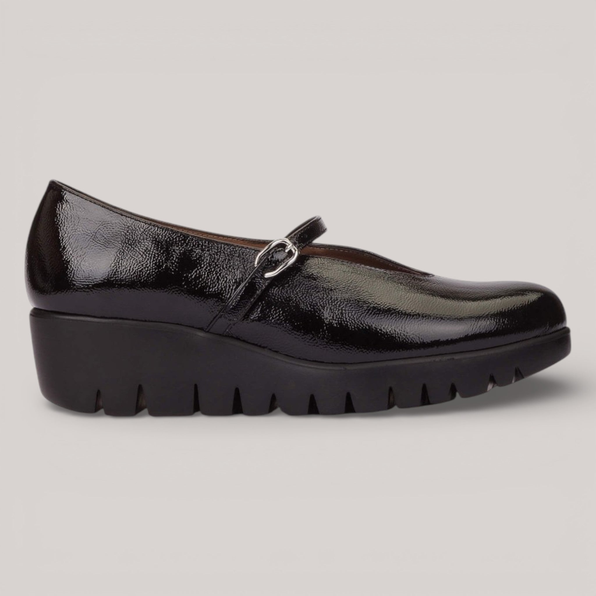 Black patent leather Mary Janes that blend timeless elegance with modern comfort. The glossy finish and delicate side strap with metal buckle create refined feminine appeal, while WondersFly™ technology by XL EXTRALIGHT® delivers exceptional lightness. MemoryGel insoles provide adaptive cushioning for all-day wearability. A sophisticated choice for those seeking both style and comfort.