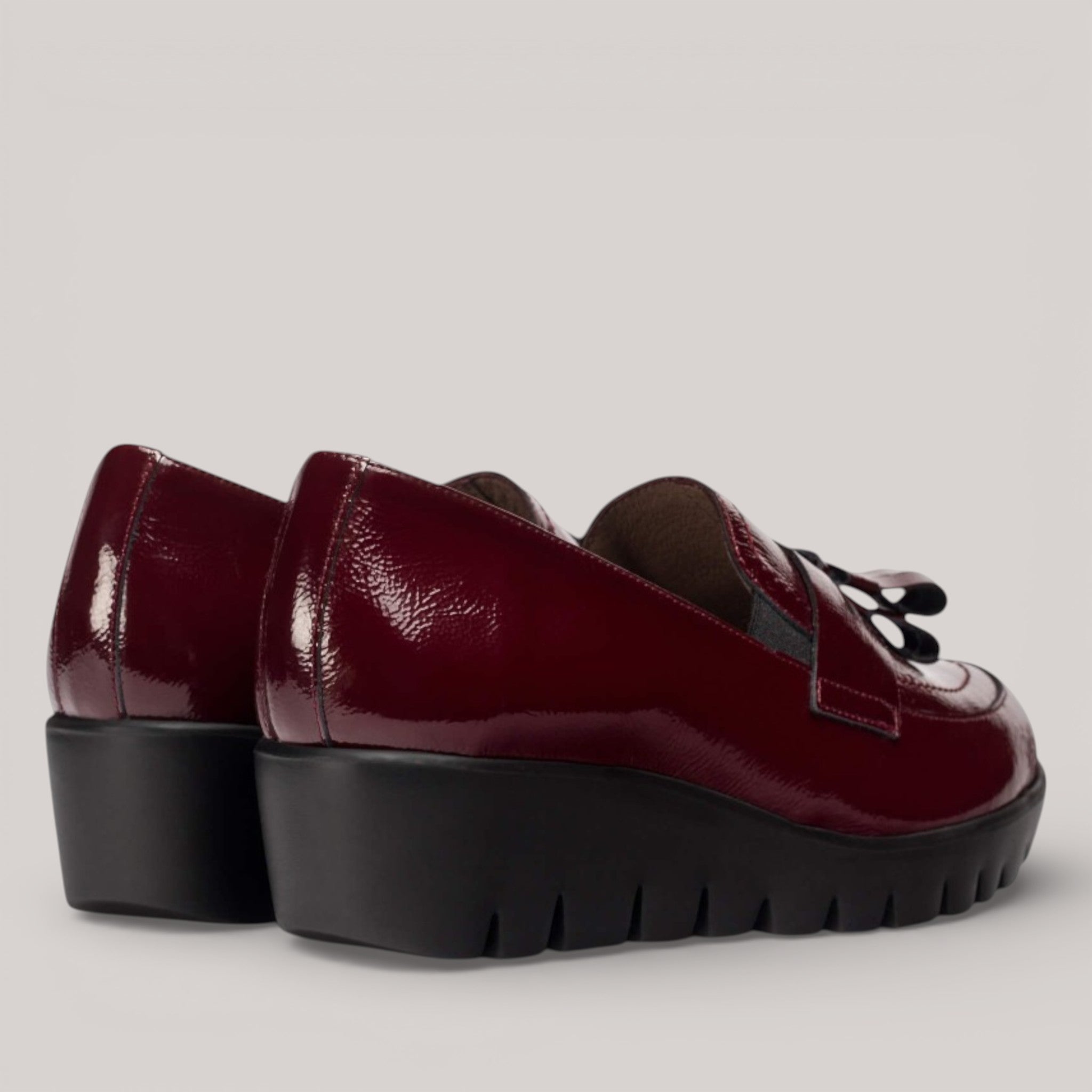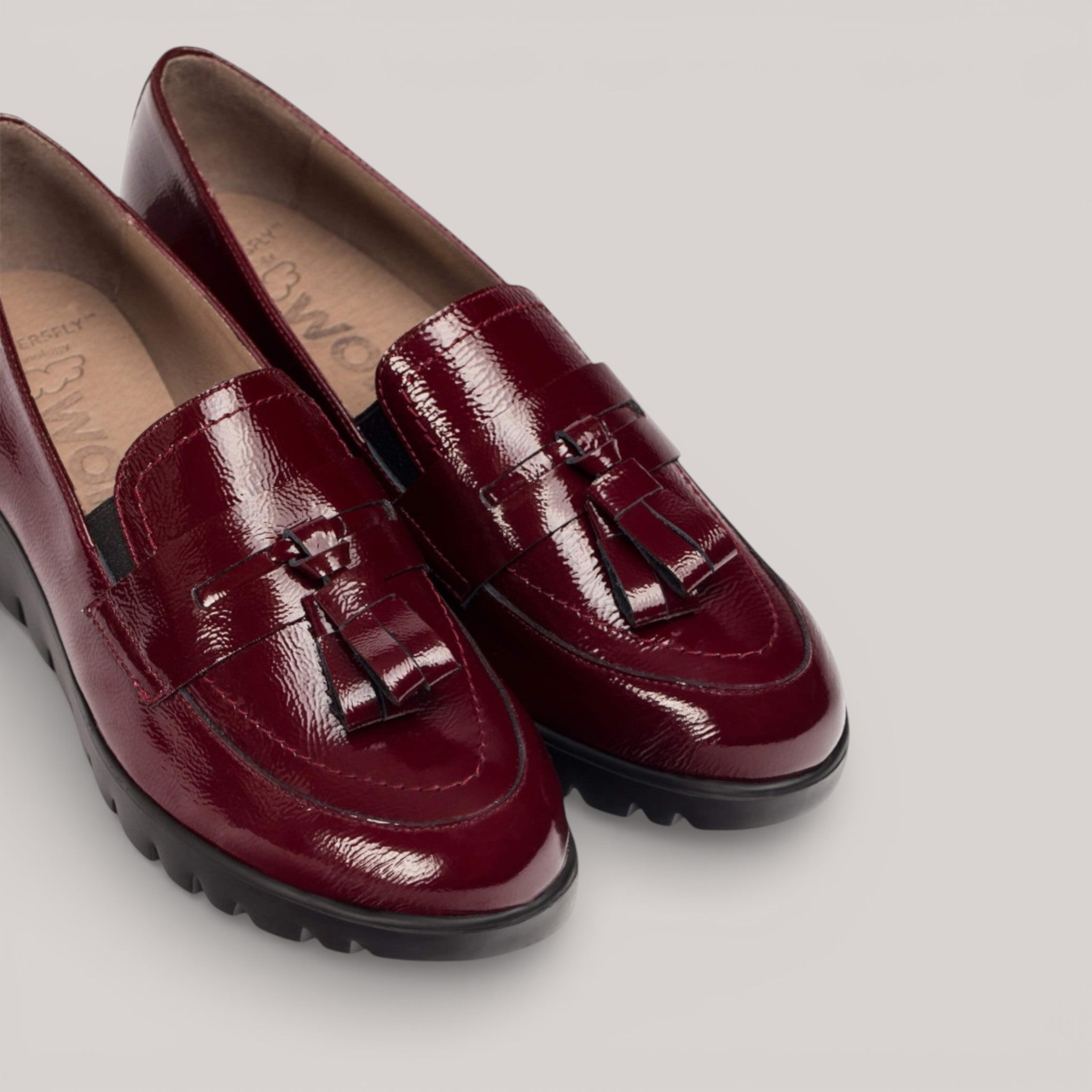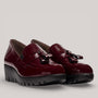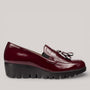 Burgundy patent leather wedge loafers with crinkled finish and fringed detailing. Elastic side inserts offer flexible support, while WondersFly™ technology ensures exceptional lightness. MemoryGel insole provides all-day cushioning. Effortlessly transitions from office to casual wear.