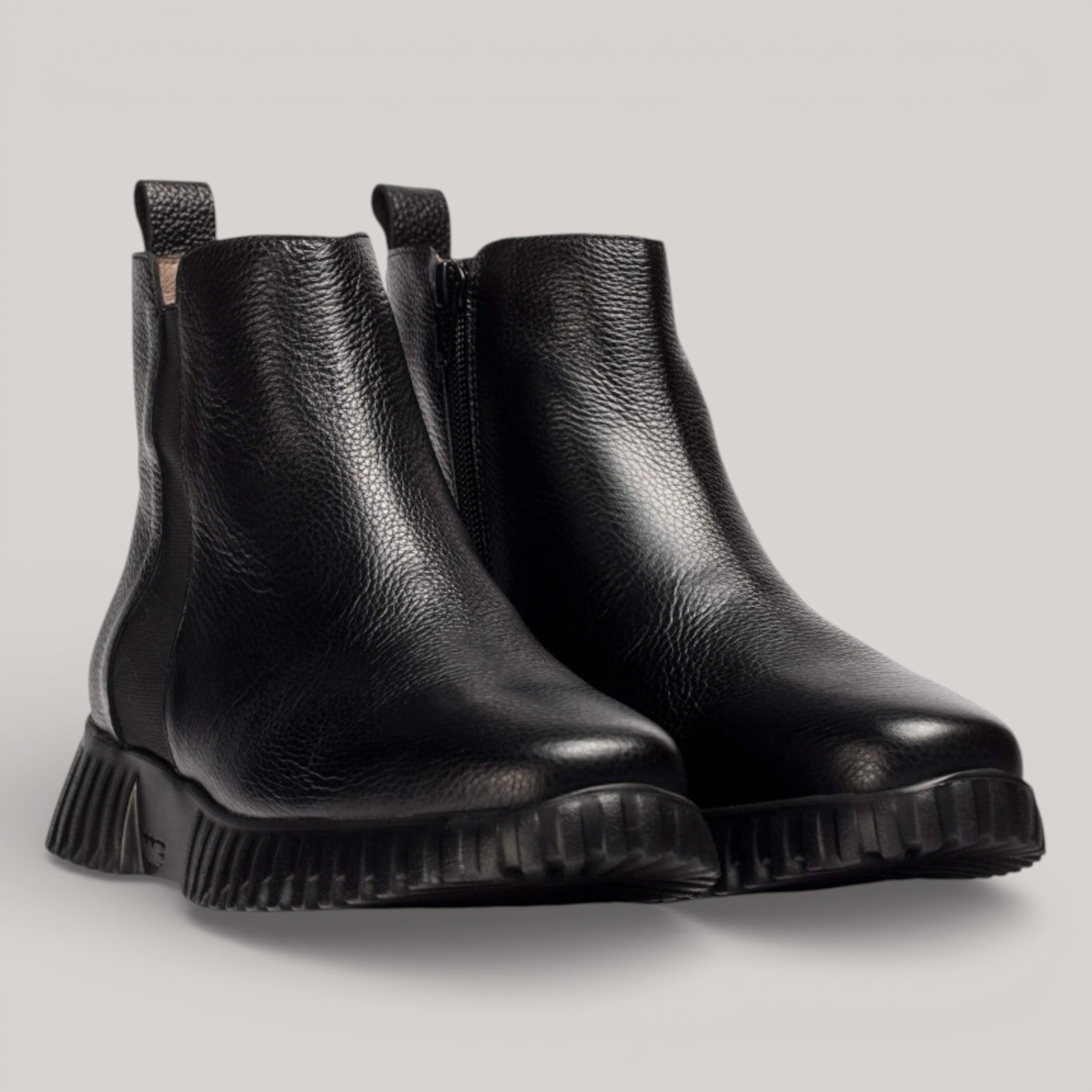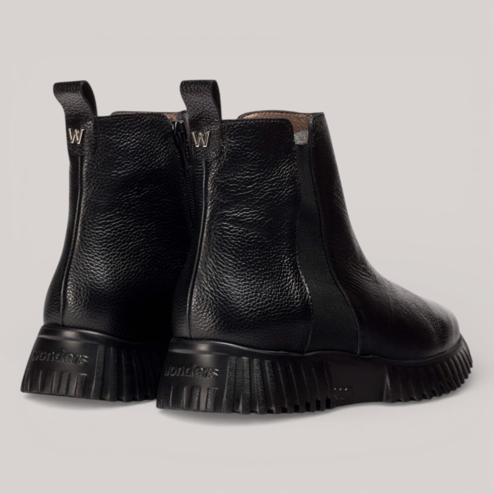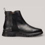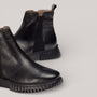 Black textured leather ankle boots with elastic side panel and rear pull tab for secure fit. WondersFly™ sole technology delivers exceptional lightness and comfort, paired with a removable MemoryGel insole that adapts to your foot's shape. Responsibly manufactured and Leather Working Group certified.