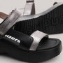 The TELVA platform sandals showcase textured leather in elegant navy blue and silver tones. Designed with a supportive front strap and an adjustable adhesive ankle strap, they offer a secure and customizable fit. Standing on a lightweight 6 cm grooved platform powered by WondersFly™ technology, these sandals deliver exceptional lightness and flexibility. The MemoryGel insole adds plush cushioning, making TELVA your perfect choice for effortless summer style.